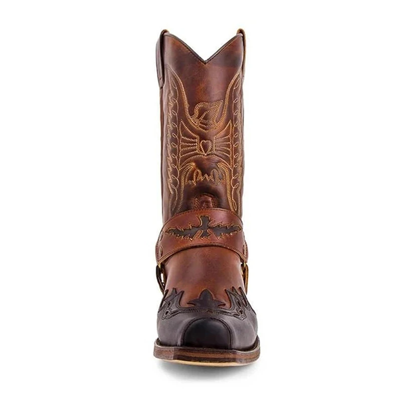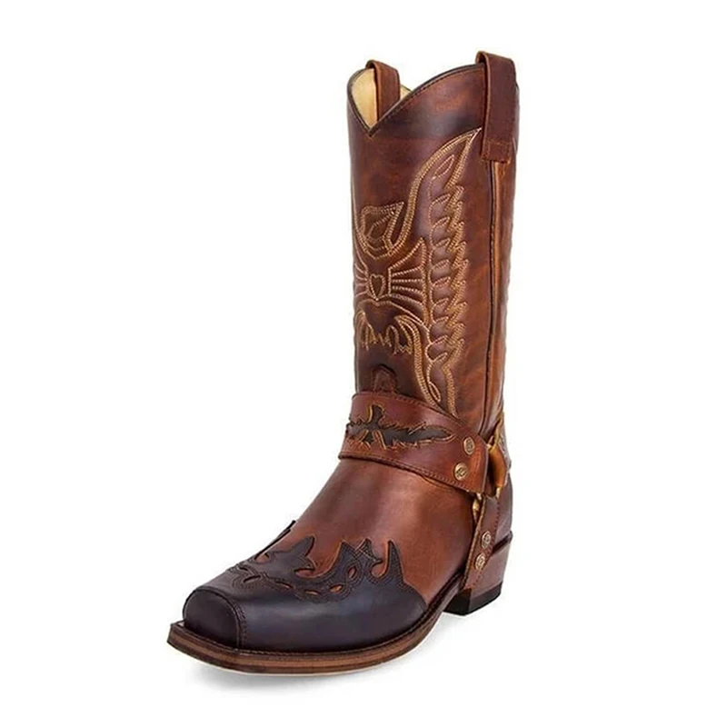 Осенне-зимние женские Модные Винтажные длинные сапоги, повседневные кожаные сапоги с вышивкой, высокие женские сапоги в Западном ковбойском стиле на низком каблуке