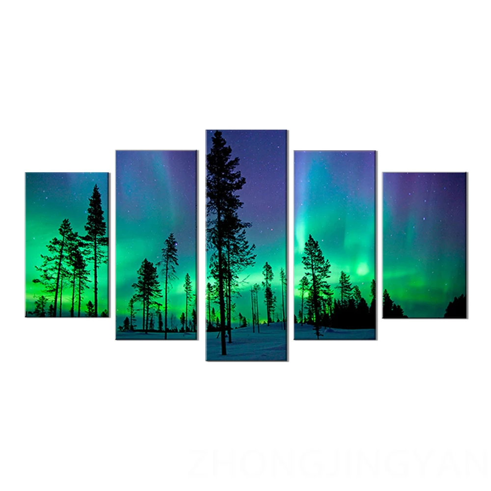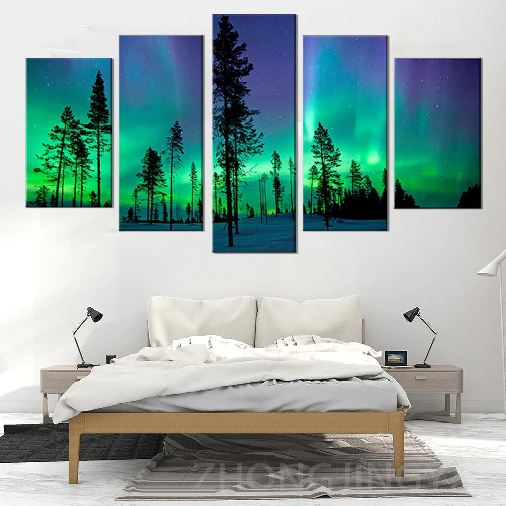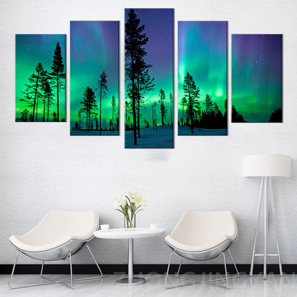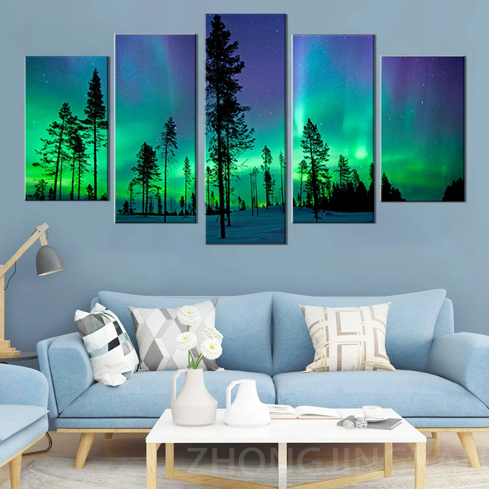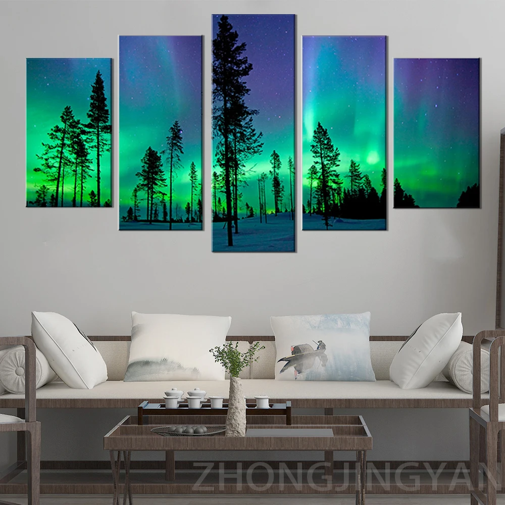 Настенные художественные картины для гостиной, HD печать, 5 шт.шт., современная картина в рамке с зеленой Авророй, постеры для домашнего декора