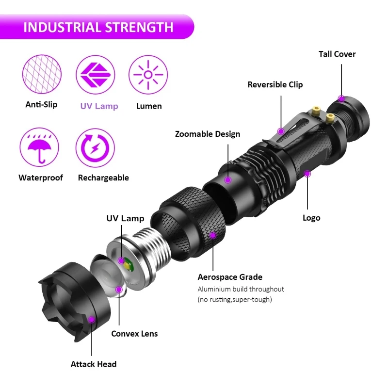 Переносной УФ-светодиодный фонарик с фокусировкой, Ультрафиолетовый фонарь для обнаружения мочи домашних животных, 395 нм, черный свет