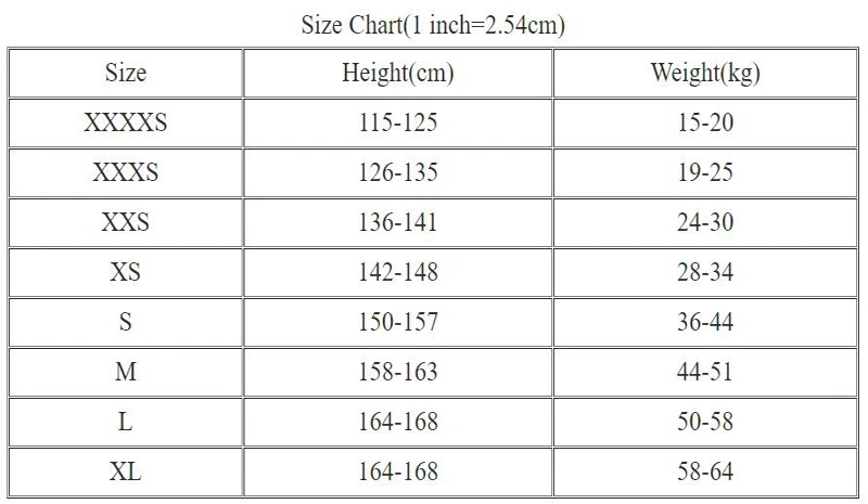 Размеры график (1 дюйм = 2,54 см) Размер Высота (см) Вес (кг) XXXXS 115-125 15-20 XXXS 126-135 19-25 XXS 136-141 24-30 XS 142-148 28-34 S 150-157 36-44 М 158-163 44-51 L 164-168 50-58 XL 164-168 58-64