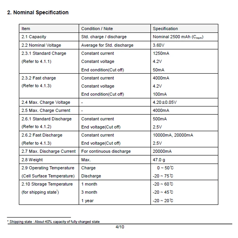 1. Модель: 18650HE22. Номинальное напряжение 3.7В3. Номинальная емкость 2500mah4. Разрядное отключение напряжения 2.5В5. Макс. Непрерывный 1.5a6. Разрядка currenent20a7.Diameter18.0 ± 0,2 мм8. Длина: 65,0 ± 0,2 мм9. Верх: плоский10. Вес ячейки (прибл.):47 г Макс.