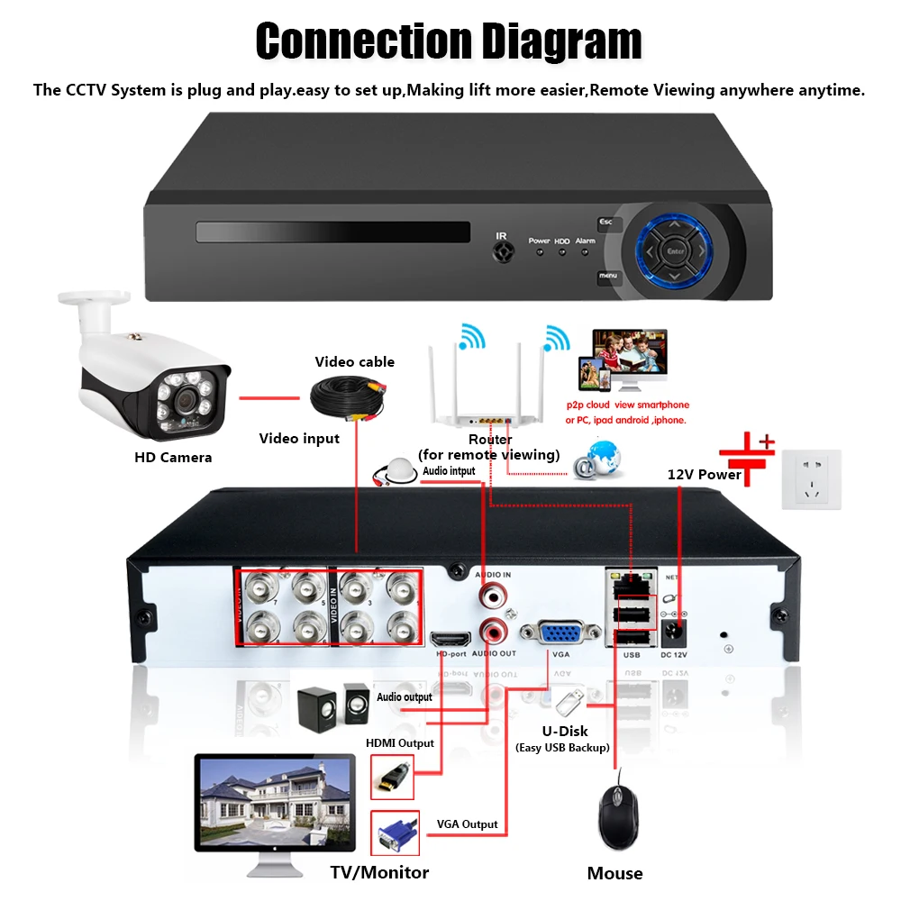 Простая настройка, всего 4 шага для просмотра на мобильный телефон,Просмотр видео в режиме реального времени в системе из любого места и в любое время с помощью смартфона, стола или ПК с передовой технологией P2P, вы можете получить удаленный доступ к вашей системе в течение нескольких минут или меньше, нет необходимости в переадресации, удаленный доступ никогда не был таким простым!