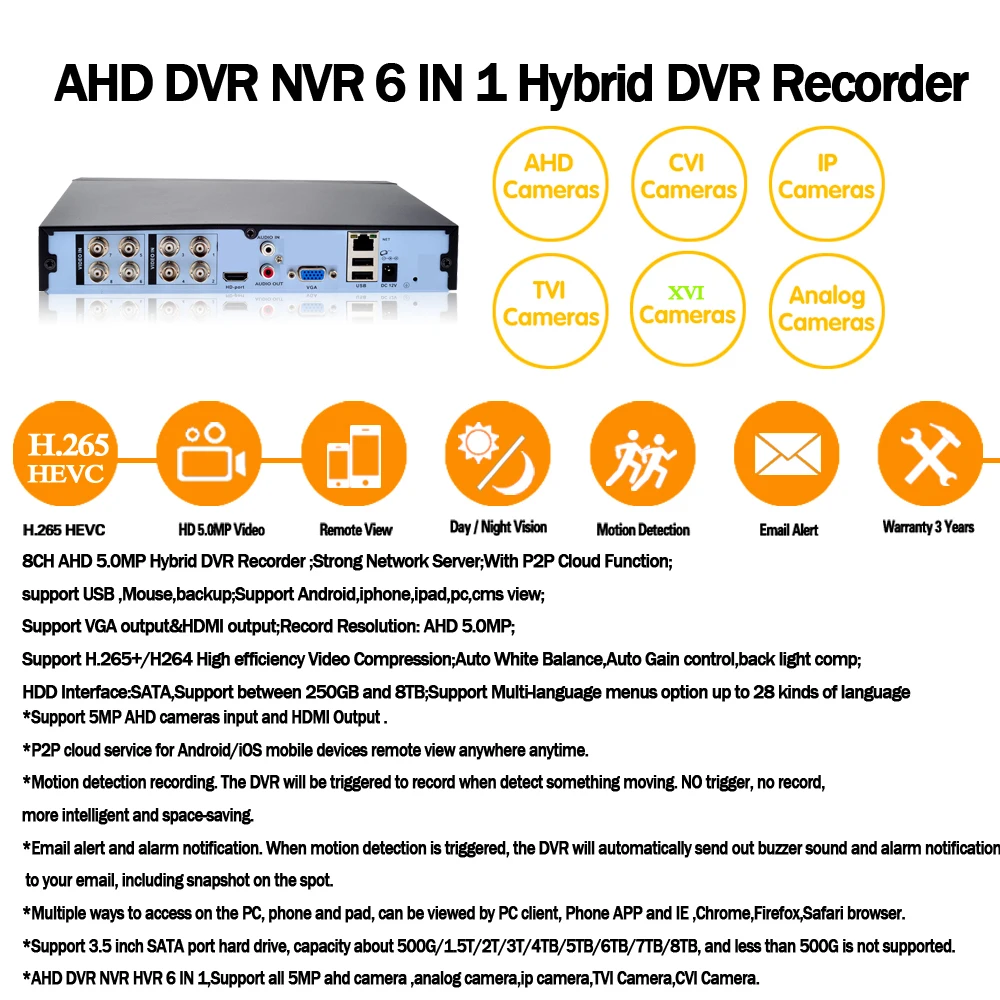 1.H.265 8CH AHD цифровой видеорегистратор;2, Ультра HD 5 Мп дисплей высокой четкости, расширенное H.265 Сжатие видео;3. Поддержка CVBS,AHD,TVI,CVI ,XVI,IP ,6 в 1 Гибридный вход;4. Поддержка распознавания лиц, записи лиц, воспроизведения лиц;5. Поддержка HDMI и VGA выход, аудио вход и аудио выход;6. Поддержка режима ночного видения Ultra HD;7. Поддержка 3,5 "дюймовый жесткий диск;8. Поддержка обнаружения движения, оповещения по электронной почте, воспроизведение видео, протокол onvif и многоязычный;9. Поддержка Android,Iphone,Ipad,PC,VMS,P2P view;10. Поддержка Plug and Play, простота установки;11. Удаленный доступ в любом месте, в любое время;