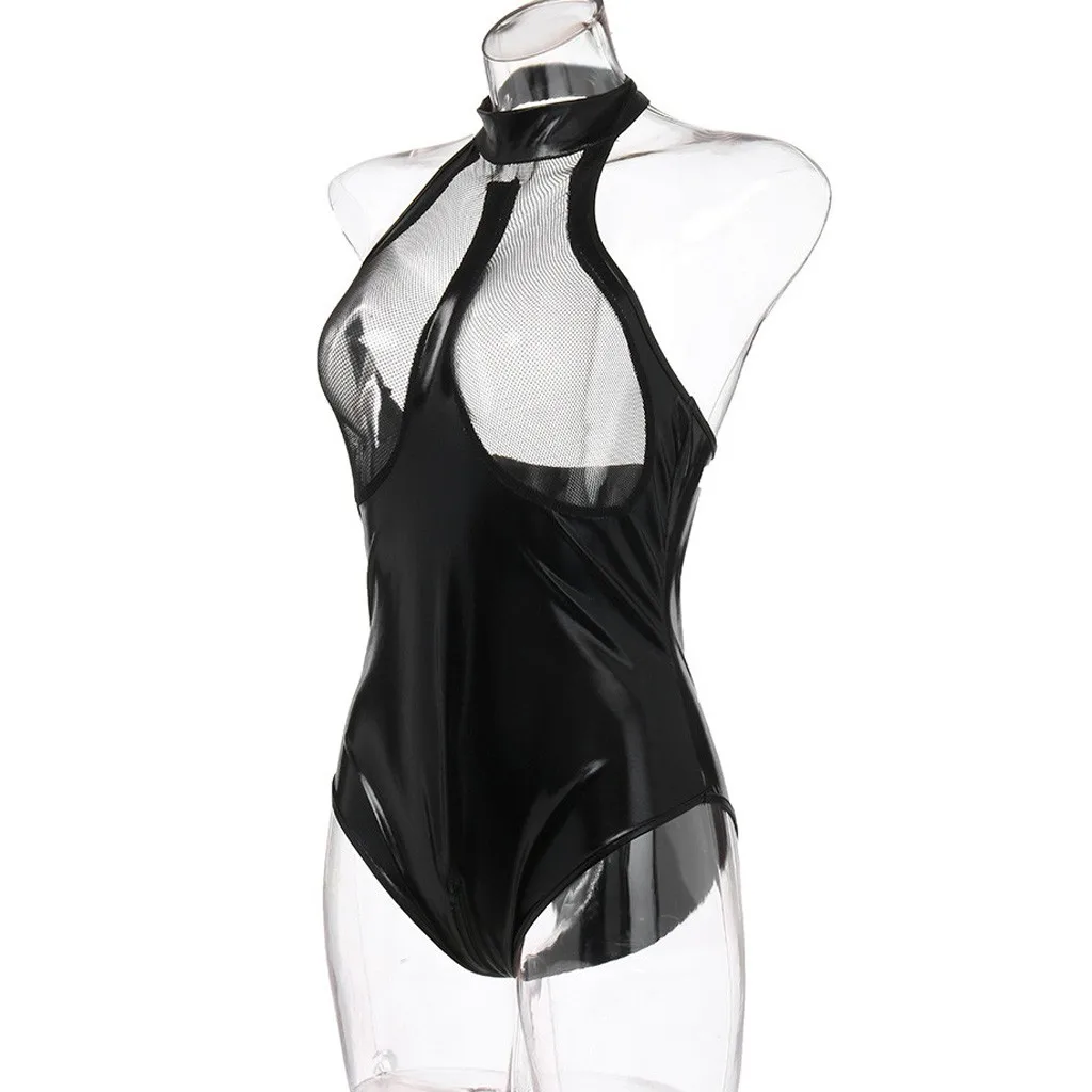Женский кожаный боди с лямкой через шею, прозрачная в крупную сетку...