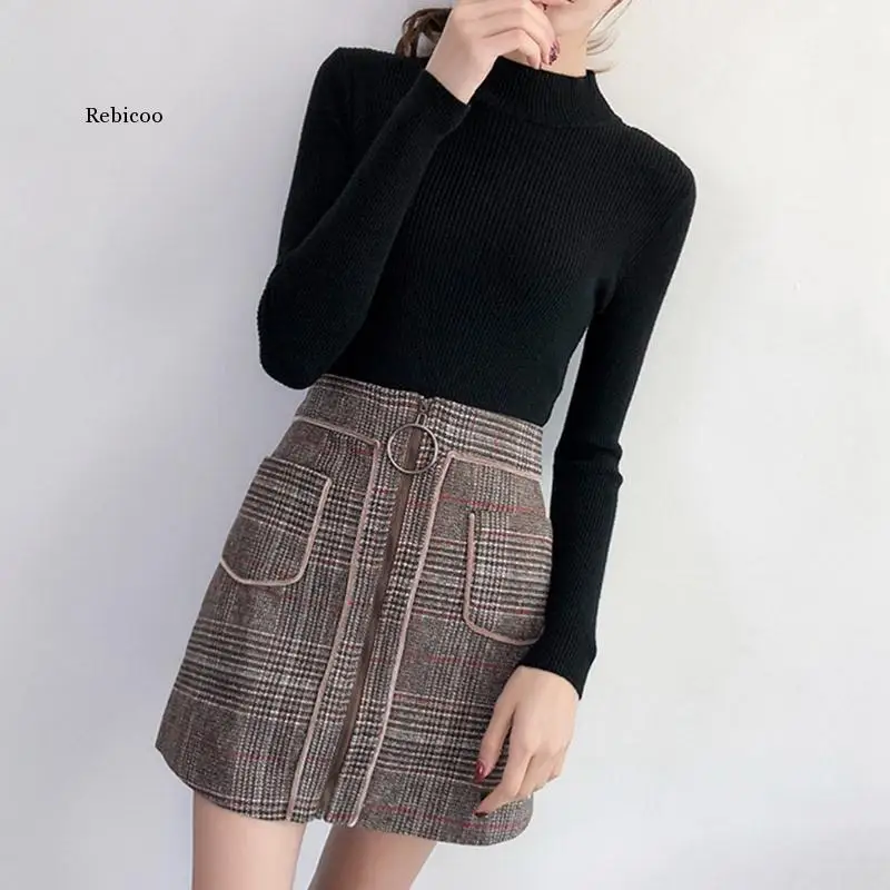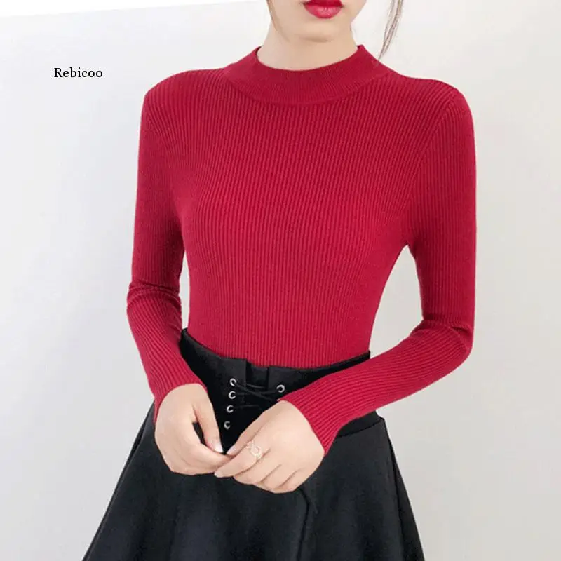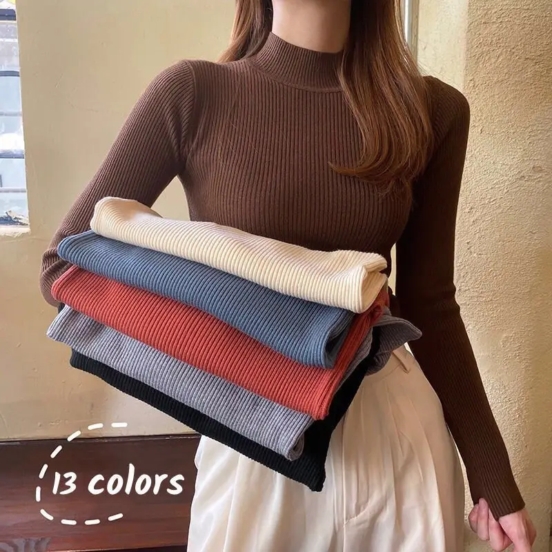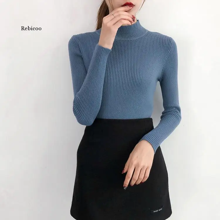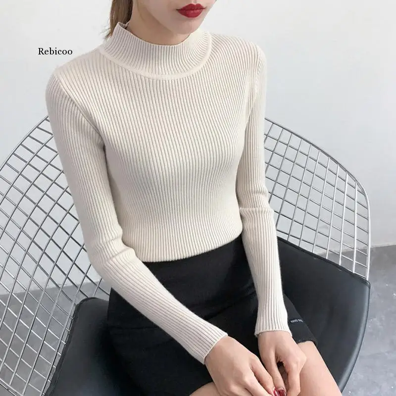 Женские пуловеры сезона осень-зима 2021, свитер, вязаный корейский эластичный Повседневный джемпер, Модный облегающий теплый женский свитер с высоким воротником
