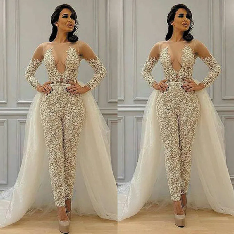 Скромные Съемная юбка-комбинезон Свадебные платья 2020 кружевное платье с длинными рукавами и аппликацией элегантный брючный костюм для женское платье Vestidos, свадебное платье
