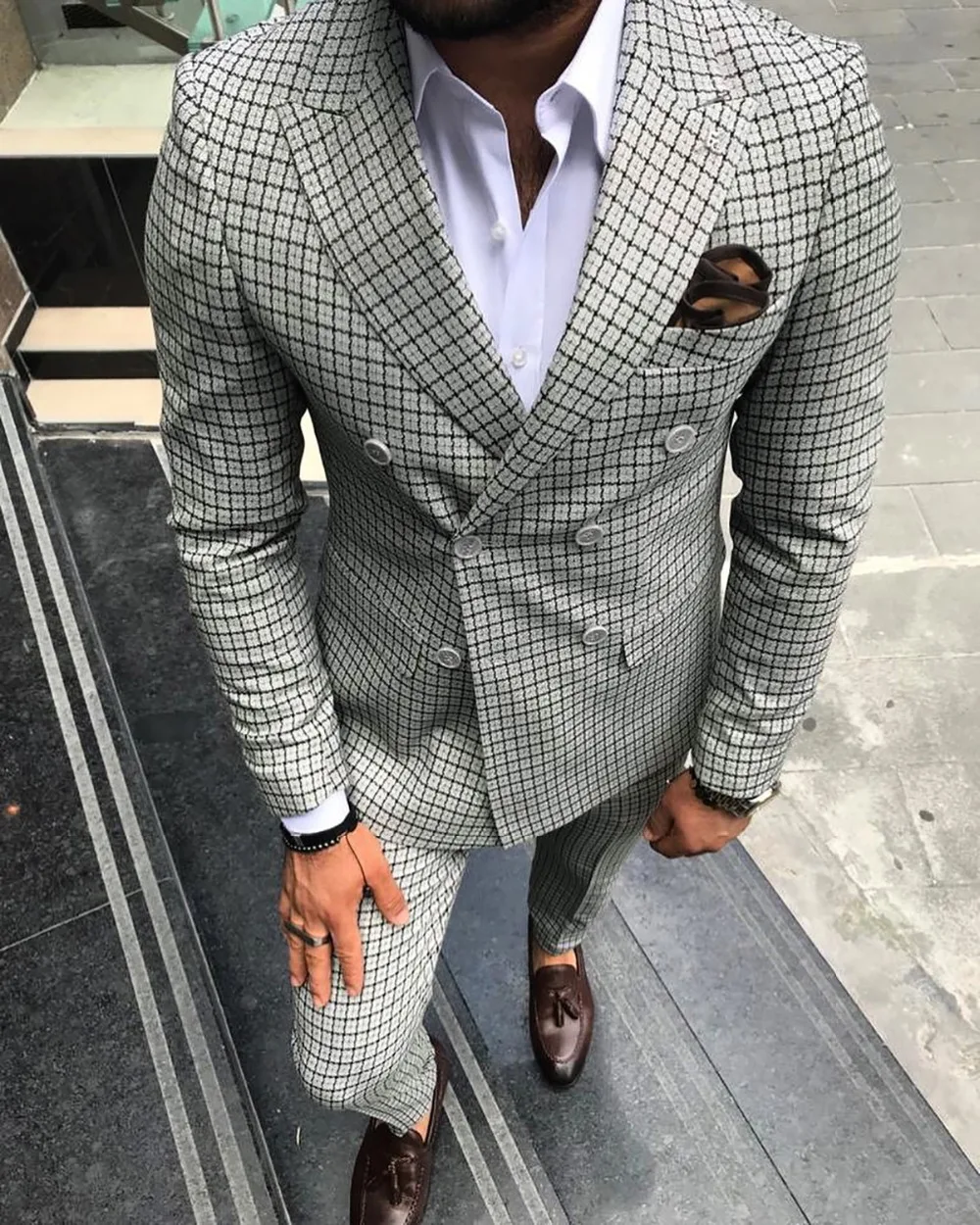 Мужской шерстяной деловой костюм, серого цвета, двубортный, классический, клетчатый, с лацканами, для свадьбы, для выпускного