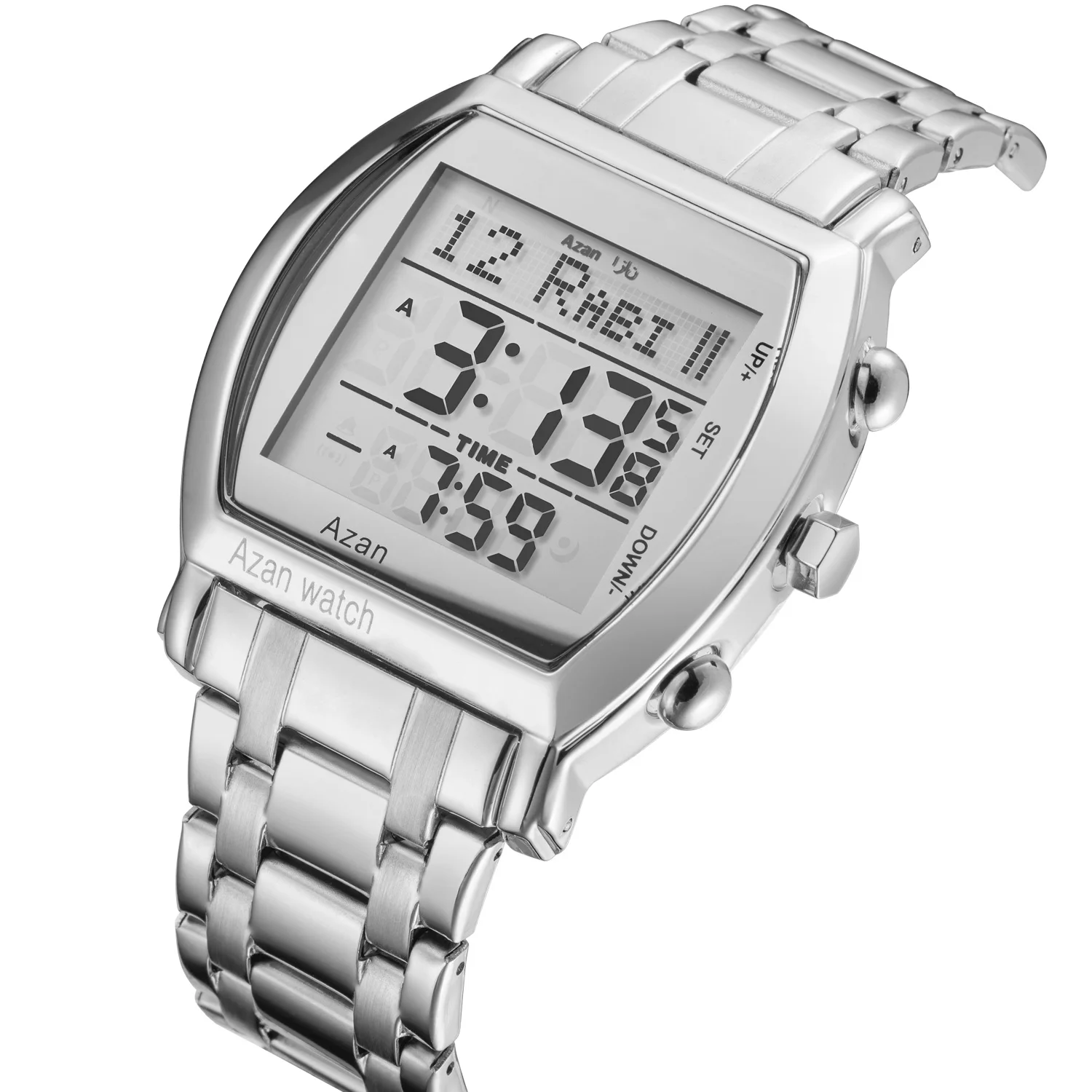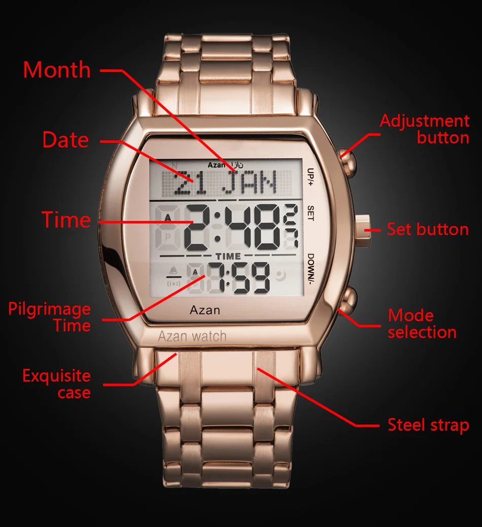 2021New прибытие мусульманская молитва montre часы розовое золото нержавеющая сталь исламский Azan наручные часы цифровые светодиодные часы