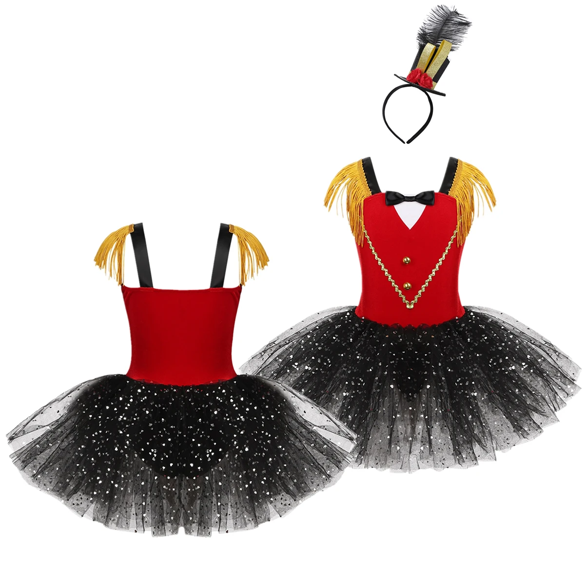 Одежда для девочек для Хэллоуина; Цирк манежа костюм; Одежда для танцев без рукавов с кисточками и бантом; Милая Фольга с блестками, платье с пачкой из сетки