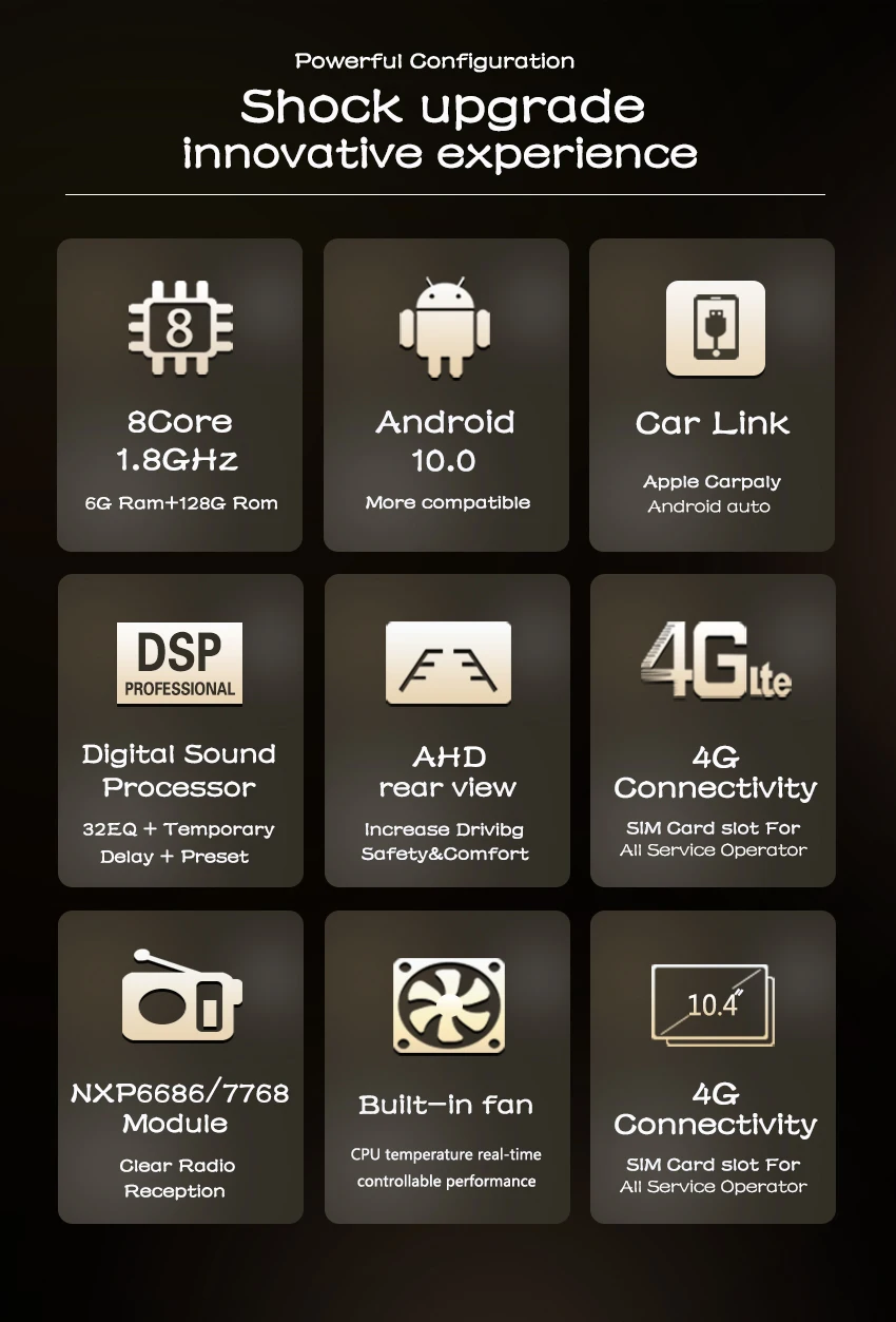 > Экран 9,7 дюймов новый бренд IPS цифровой сенсорный экран-Экран, тренд, модная, с полным сенсорный кнопочные клавиши, отказался отставать, 1024*768 разрешение> Версия системы:A. Восьмиядерный 3 Гб RAM 32 Гб ROMB. Восьмиядерный 4 Гб RAM 64 Гб ROM> ОС Android 10,0> Intel USI7862 Octa Core 1,8 ГГц> Встроенный 32DSP, супер качество звука> 5G WIFI и сеть 4G> Внутренний Carplay, проводной и беспроводной в наличии> Усилитель IC:ST7850 радио IC: NXP6851> Поддержка сплит-экрана> Специальная функция1. Он может поддерживать управление рулем2, поддержка 1080P Поддержка музыки без потерь3, поддержка послепродажной камеры, встроенный микрофон4. Поддержка Bluetooth hands-free5. Поддержка онлайн навигации Google Maps6. Поддержка эквалайзера для регулировки звука для улучшения результатов7. Поддержка онлайн-видео, фильмов, музыки, радио, Youtube, Yahoo, MSN...8. Fm-станции поднимают настроение во время путешествия.> Опциональная функция 1, поддержка автомобильного видеорегистратора, usb-камеры (с ADAS) 2, поддержка автомобильных TPMS 3. Поддержка carplay>Важные советы:1. Этот блок поддерживает оригинальный сабвуфер2. Данное устройство не поддерживает оригинальную резервную камеру.3. Этот блок имеет 2 порта usb4. Когда музыка не играет, вы можете услышать статический шум типа при очень низком уровне громкости5. Не поддерживает радио XM6. Светодиодная подсветка синего цвета.7. Температура указана только по Цельсию. Пробег показывает только километры