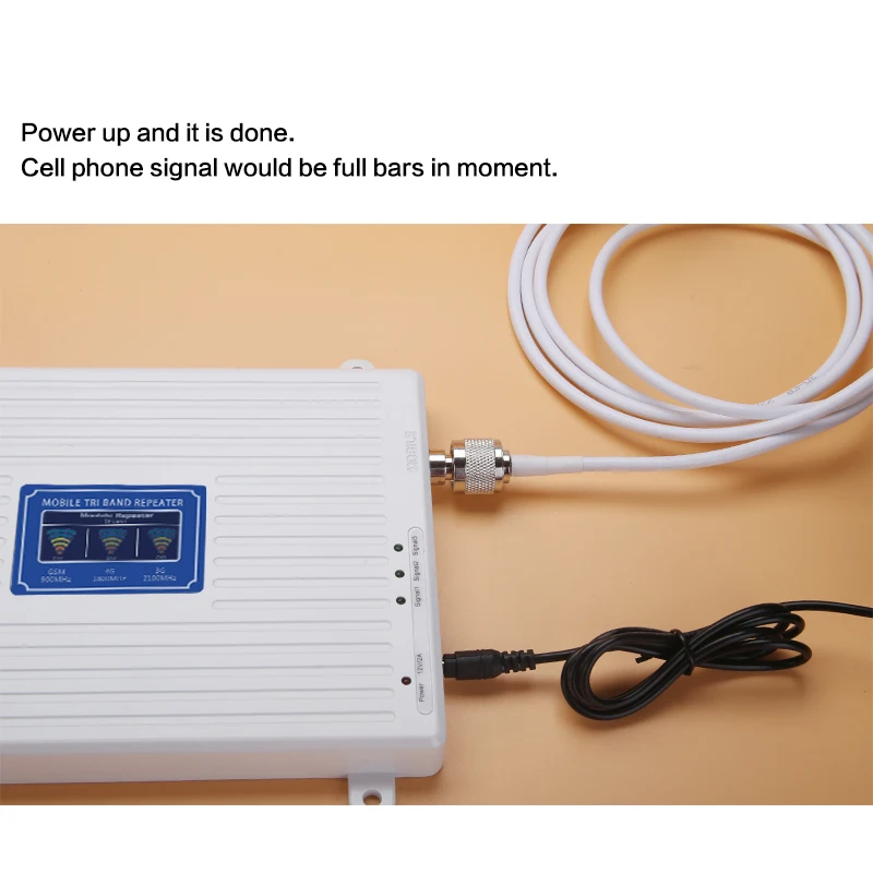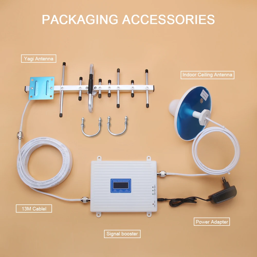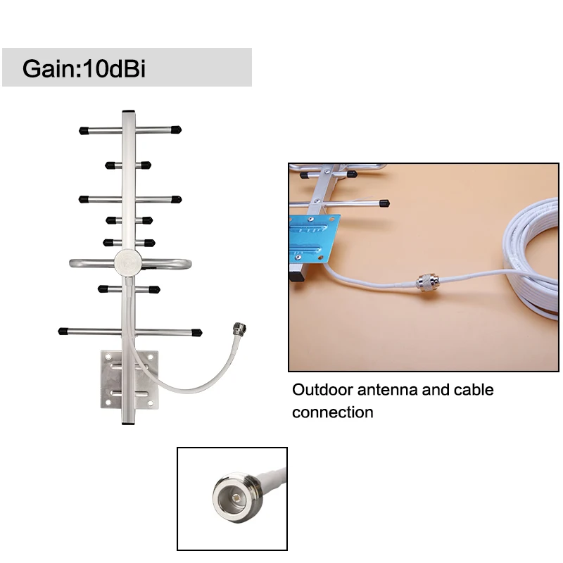 1. Рабочая система: 2g + 3g + 4g (900/1800/2100 МГц) 2. Частотный диапазон GSM 900 МГц = Band 8 = Uplink:890 ~ 915 МГц, Downlink:935 ~ 960 МГц; DCS 1800 MHz = Band 3 = Uplink:1710 ~ 1785MHz, Downlink:1805 ~ 1880MHz; WCDMA 2100 МГц = Band 1 = Uplink:1920 ~ 1980 МГц, нисходящий канал: 2110 ~ 2170 МГц; 3. Площадь покрытия: 200 ~ 500 квадратных метров без каких-либо препятствий 4. Рабочая температура: -10 ℃ ~ 55 ℃. Наружная антенна является водонепроницаемой и термостойкой.