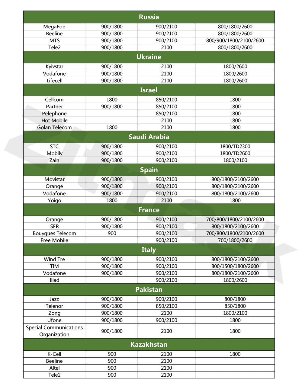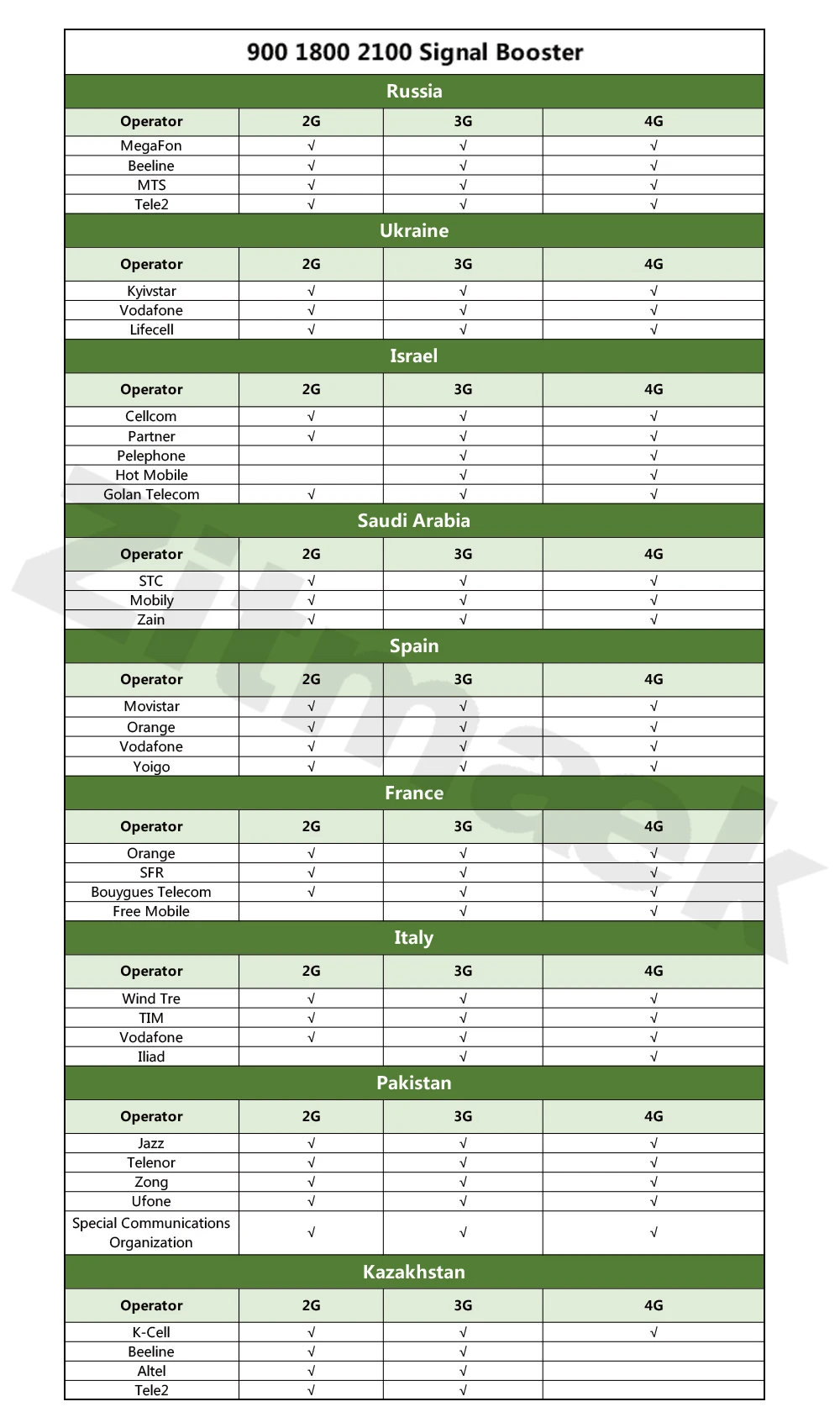 Этот повторитель может повысить голос и 2g 3g 4g интернет для европейских стран. В том числе: Россия, Украина, Израиль, Саудовская Аравия, Испания, Франция, Португалия, Италия, Новая Зеландия, Казахстан и т. Д.