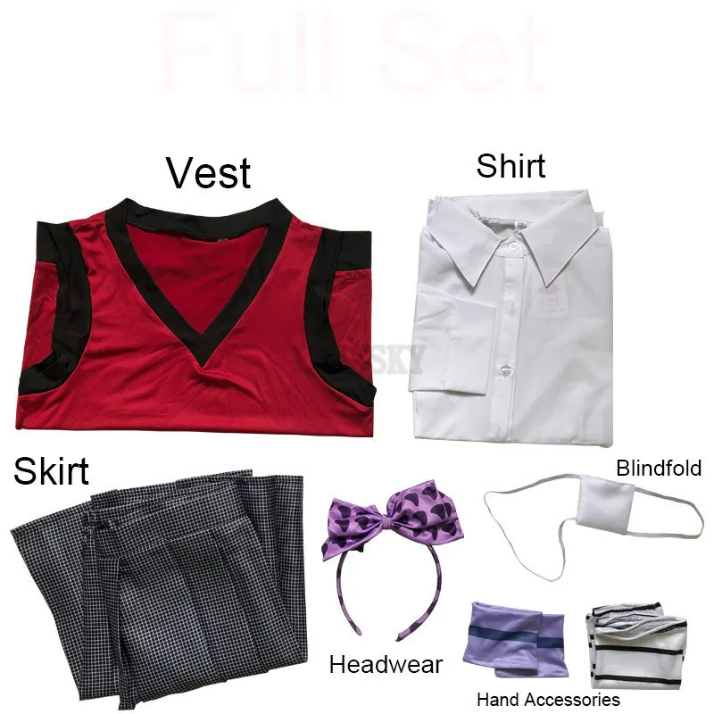 Аниме: какегуруи компульсивный игрокПерсонаж: икишима мидариКомплектация: жилет + рубашка + юбка + головной убор + аксессуары для рук + маска на глаза + носки.Парик: около 35 см в длину, черный и фиолетовый, импортный высокотемпературный шелк, окружность головы 50-60 см.