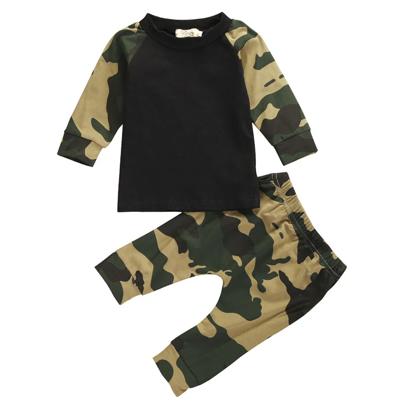 От 0 до 2 лет комплекты одежды для новорожденных мальчиков Милая камуфляжная футболка для детей длинные штаны армейский зеленый комплект одежды из 2 предметов