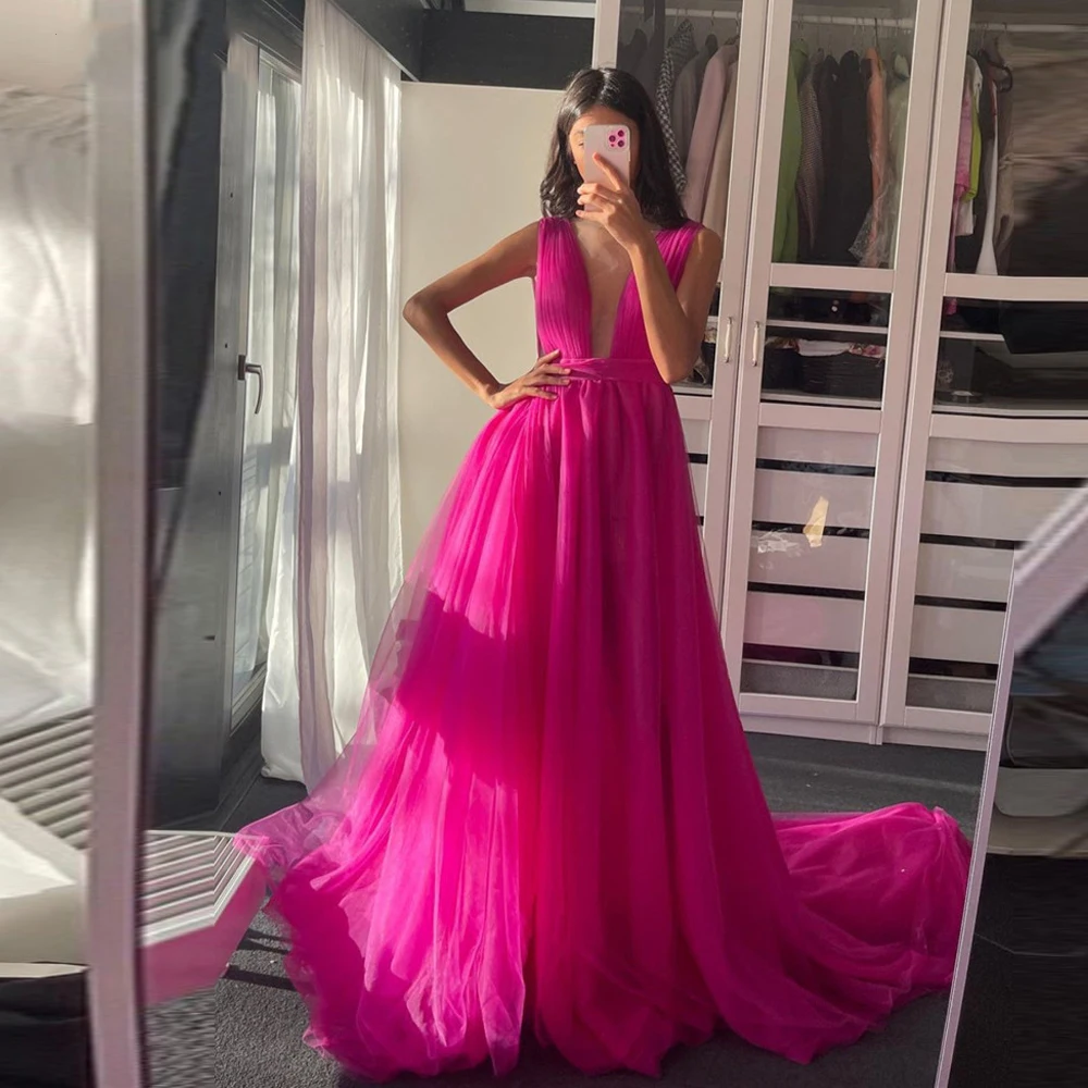 Элегантное платье Sevintage для выпускного вечера, цвет фуксия, простое мягкое Тюлевое строгое платье с глубоким V-образным вырезом для особых случаев