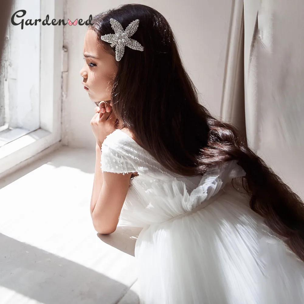 Милое белое Цветочное платье для девочек, Тюлевое Пышное детское платье до колена с открытой спиной для детской свадебной вечеринки, платье принцессы
