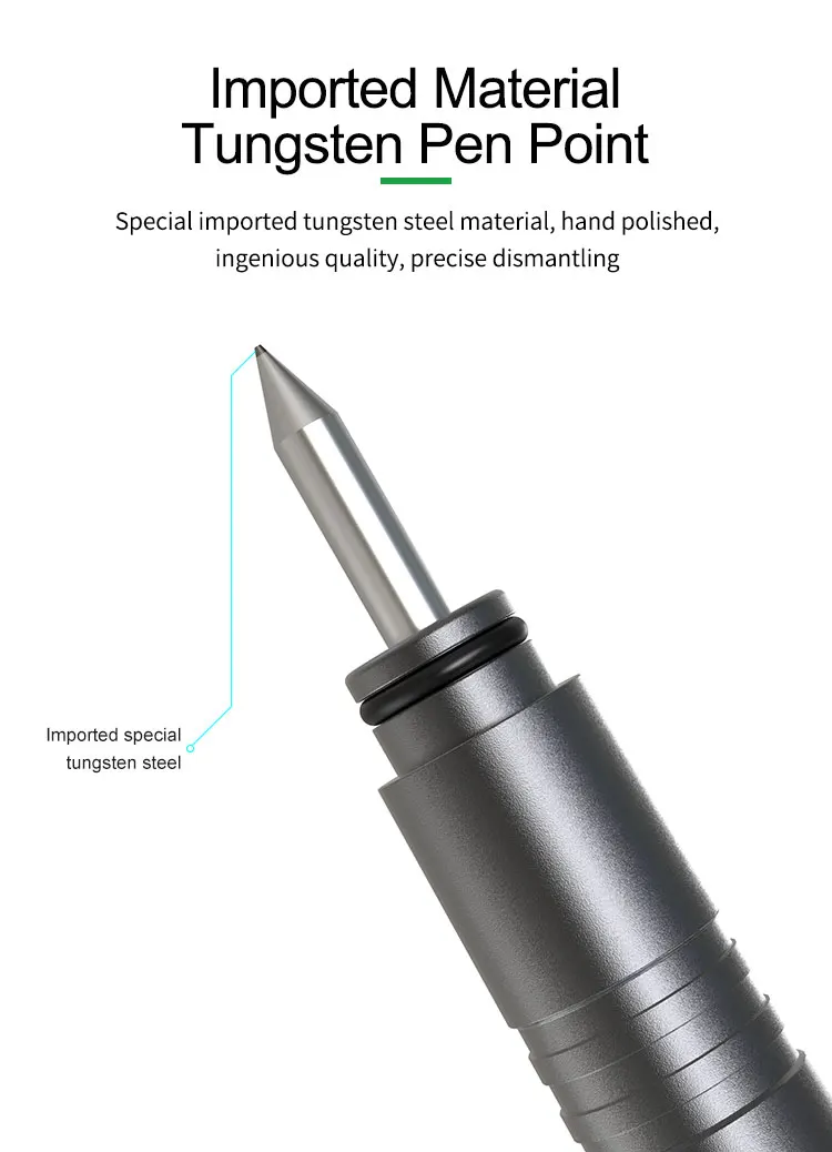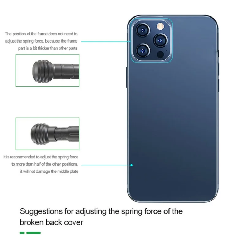1. Подходит для разборки и ремонта модуля объектива серии IP8-12 Pro Max и другой мобильный телефон, стеклянная задняя крышка 2. Специальный импортный вольфрамовый стальной материал, ручная полировка, оригинальное качество, точный демонтаж 3. Пружинный аккумулятор, регулировка герметичности
