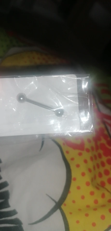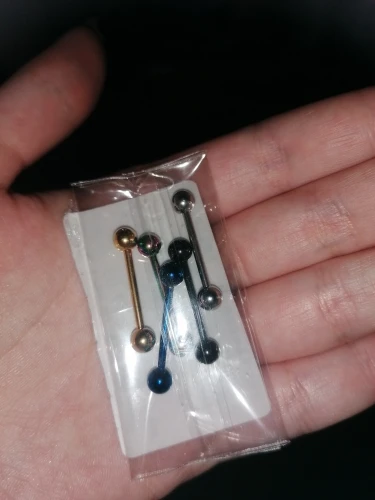 товар пришел прям очень быстро. Обычная небольшая серёжка. от того что стержень небольшой комфортно сидит,во рту не ощущается,предыдущая была длиннее хоть и ходила с ней три года,но все ровно немного в небо упиралась.