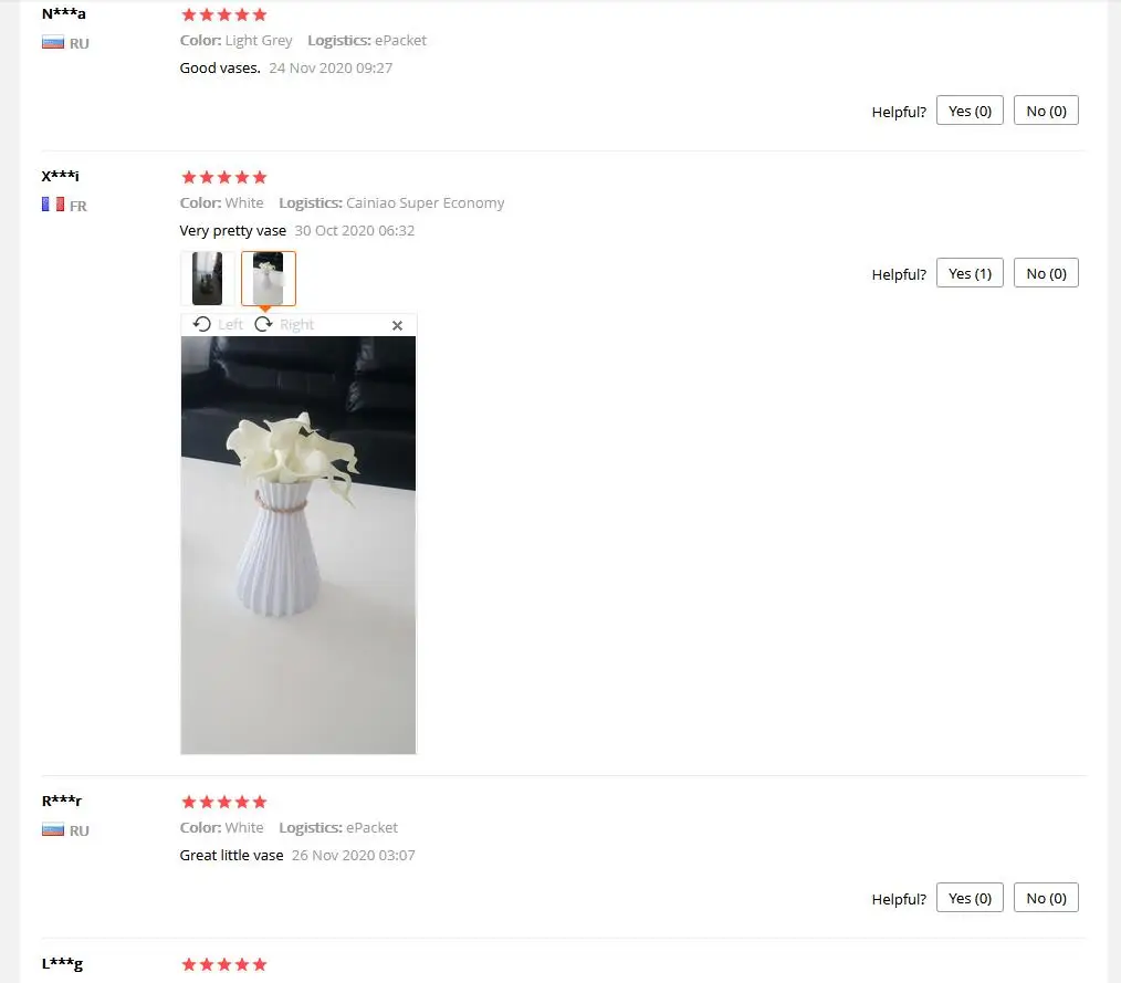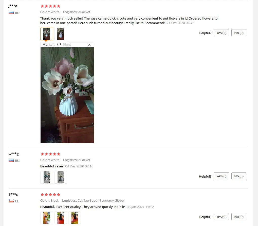 Ваза неплохая. Несмотря на то, что упакованы были в тонкий пупырчатый пакет, особых повреждений нет, только пара мелких царапин. Цвет не совсем белый, скорее слоновая кость. Товар был отправлен быстро, пришел за 2 недели.
