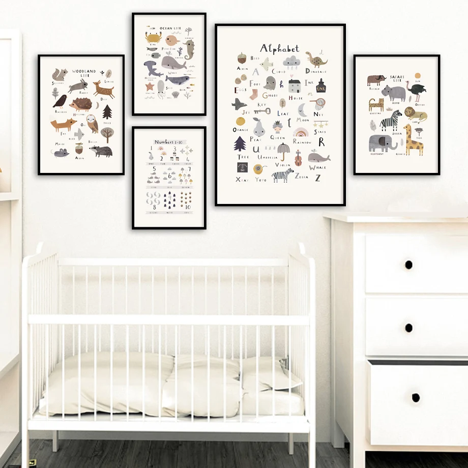 Мультяшные животные Алфавит цифры скандинавские плакаты и принты об...