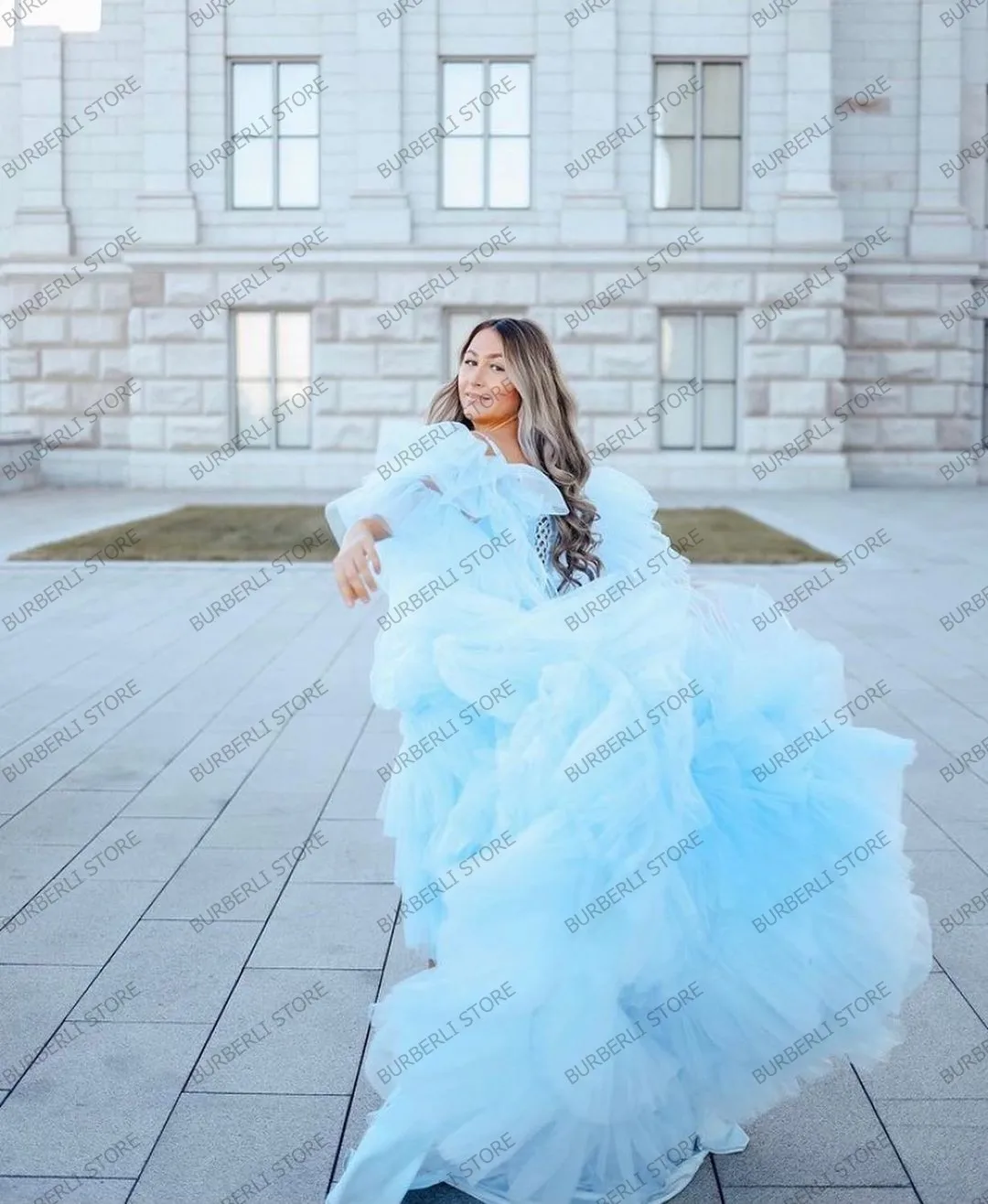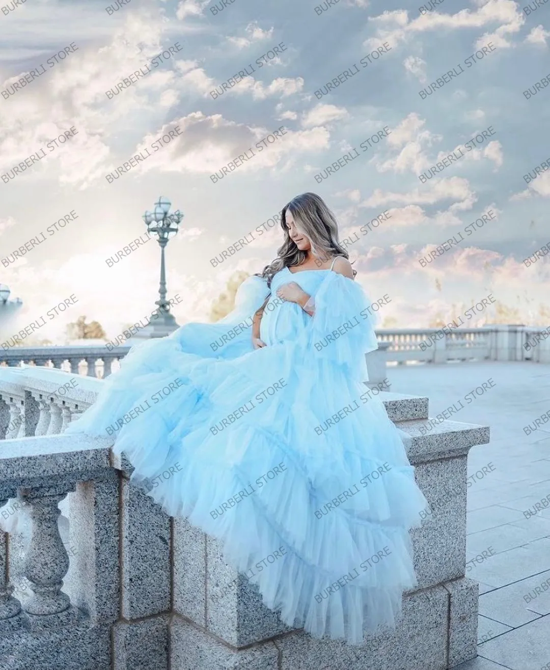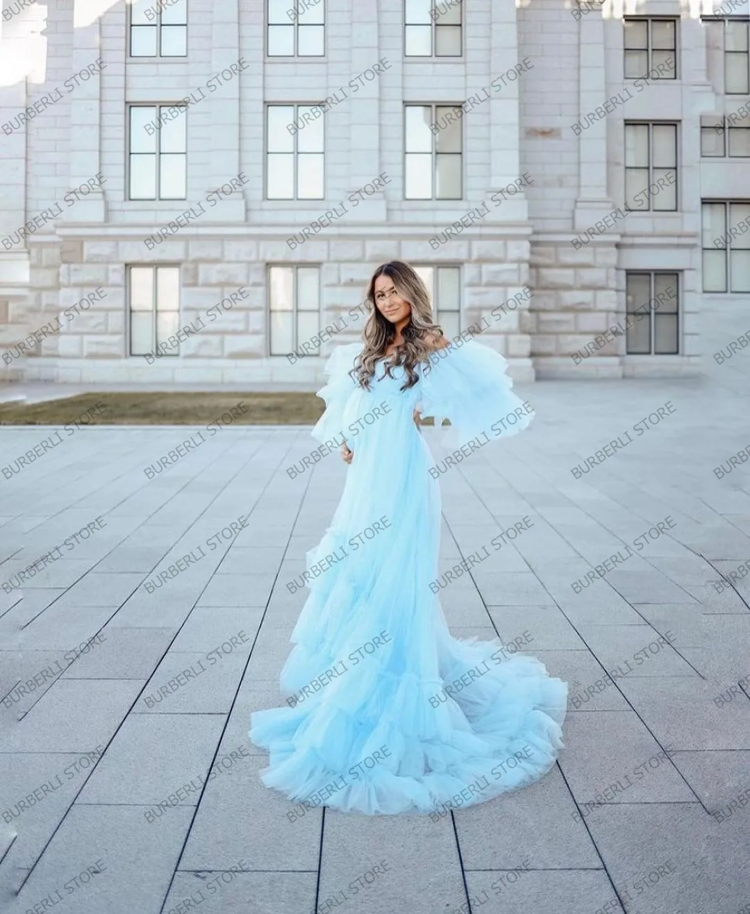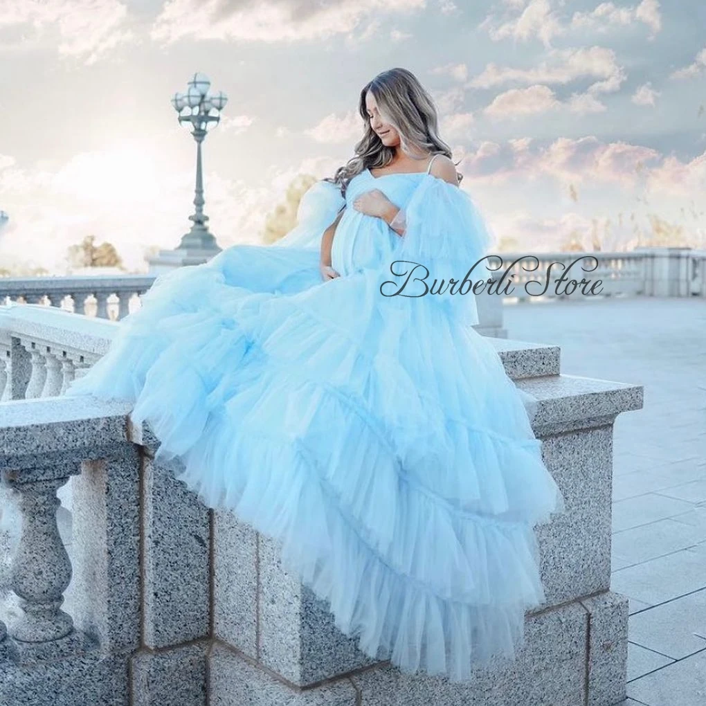 Demure небесно-голубое Тюлевое ТРАПЕЦИЕВИДНОЕ платье для беременных с оборками для фотосессии ДРАПИРОВАННОЕ Сетчатое длинное женское вечернее платье платья
