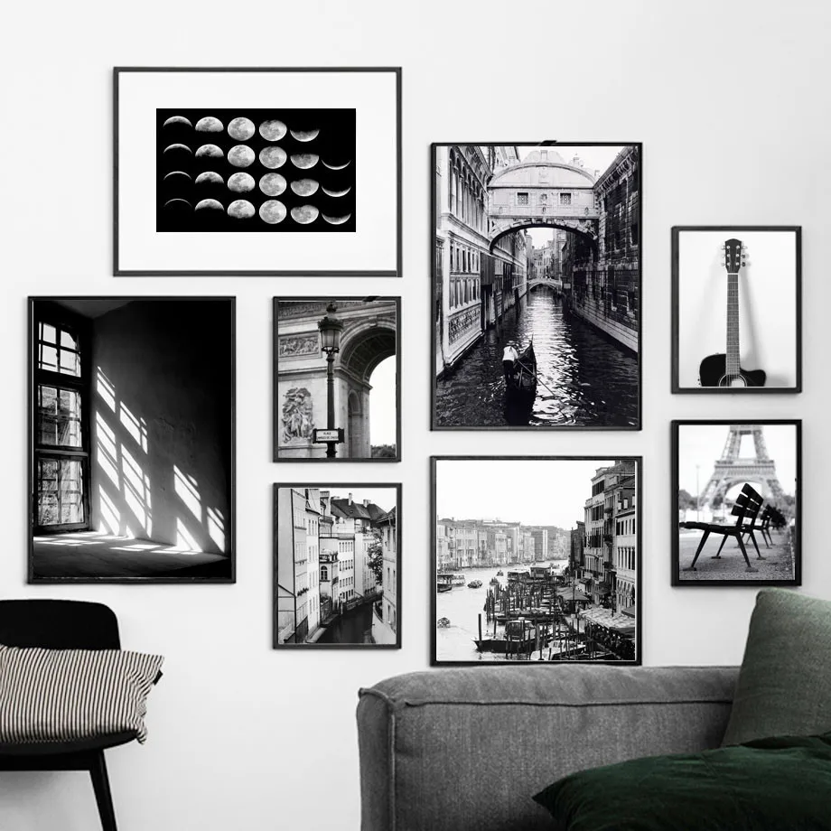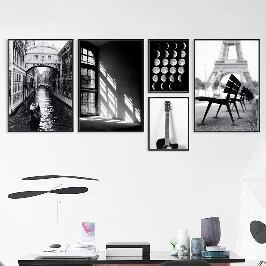 Настенные картины с изображением Парижа, Венеции, окон, гитары, Луны, черного и белого цвета, скандинавские плакаты и принты, настенные картины для гостиной, бара
