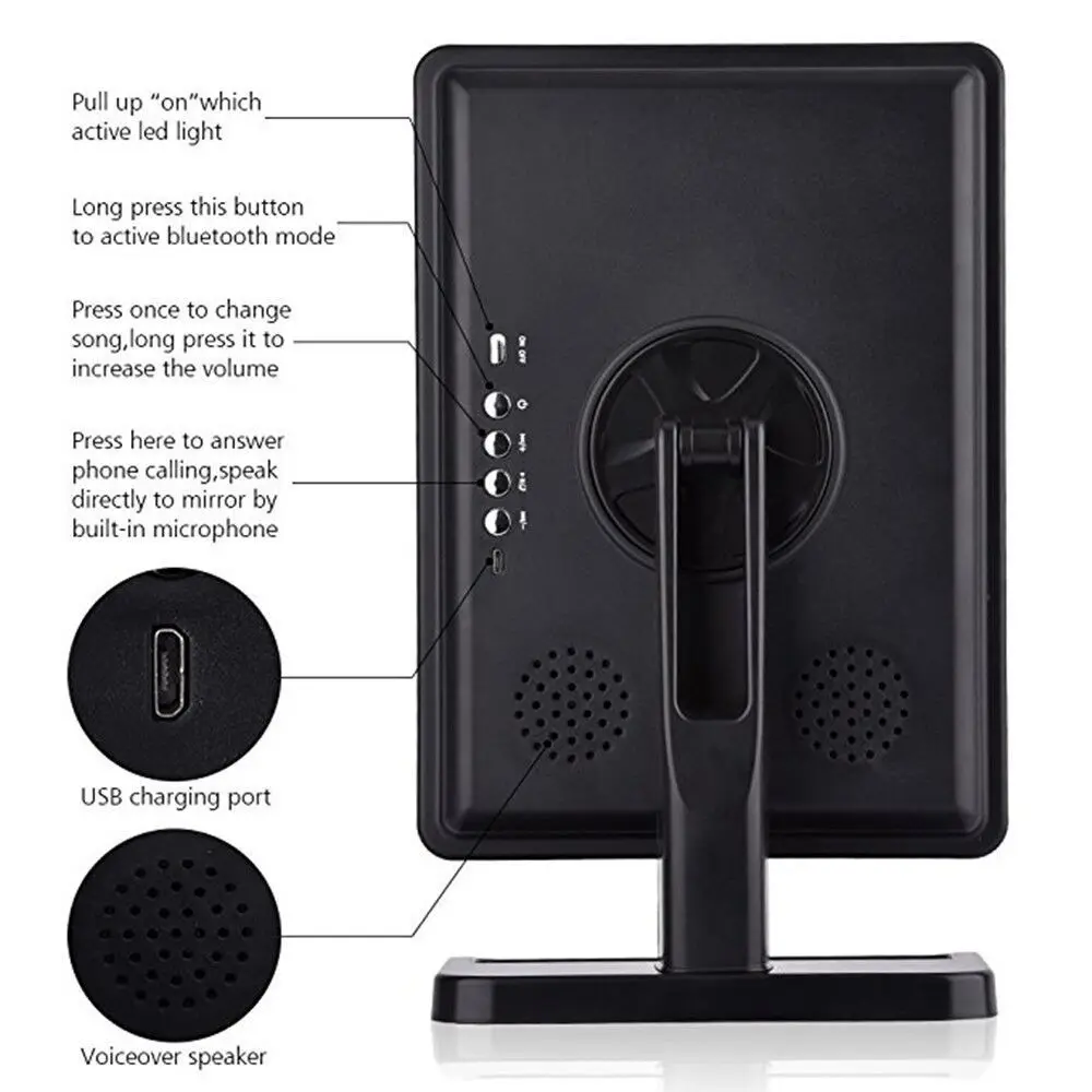 Bluetooth музыкальное зеркало настольное с 20LED светильник зеркало для макияжа Сенсорное затемнение настольное зеркалоBluetooth аудио светодиодный зеркало для макияжа с увеличительным стекломВерсия Bluetooth: 5,0Материал: АБС + стеклоКоличество ламп: 20 светодиодныйДинамик: 5 ВтЕмкость аккумулятора: 3.7V1500MAHЭффективное расстояние Bluetooth: 10 метровВремя воспроизведения музыки: 3-4 часаЦвет: белый, черный, розовый, золотой, розовое золото, серебристыйИнструкции:1. Прежде чем касаться сенсорного выключателя, убедитесь, что кнопка включения/выключения на задней панели находится в положении включения.2. Сенсорный датчик света переключатель и индикатор светильник будет светильник или похода по магазинам.3. Снова коснитесь сенсорного выключателя, и светильник индикатора погаснет.4. Прикоснитесь к сенсорному выключателю в течение длительного времени, чтобы увеличить яркость, снова коснитесь, чтобы уменьшить светильник.