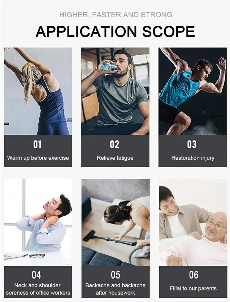 -Облегчение жесткости и болезненности: массажер используется для облегчения мышечной жесткости и болезненности, способствует циркуляции крови и лимфы, ускоряет восстановление после физических упражнений и спортивных травм, улучшает общее здоровье мягких тканей организма и предотвращает воспаление, вызванное адгезией между фасцией и мышцами.
