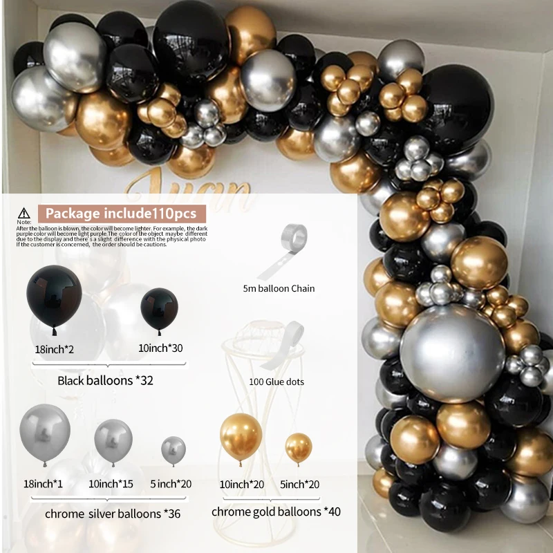 Хромированные золотые шары * 405 дюймов * 20 10 дюймов * 20Хромированные Серебристые шары * 365 дюймов * 20 10 дюймов * 15 18 дюймов * 1Черные шары * 3210 дюймов * 30 18 дюймов * 21 шт. 5 м цепочка для воздушных шаров, 1 шт. 100 точечный клей