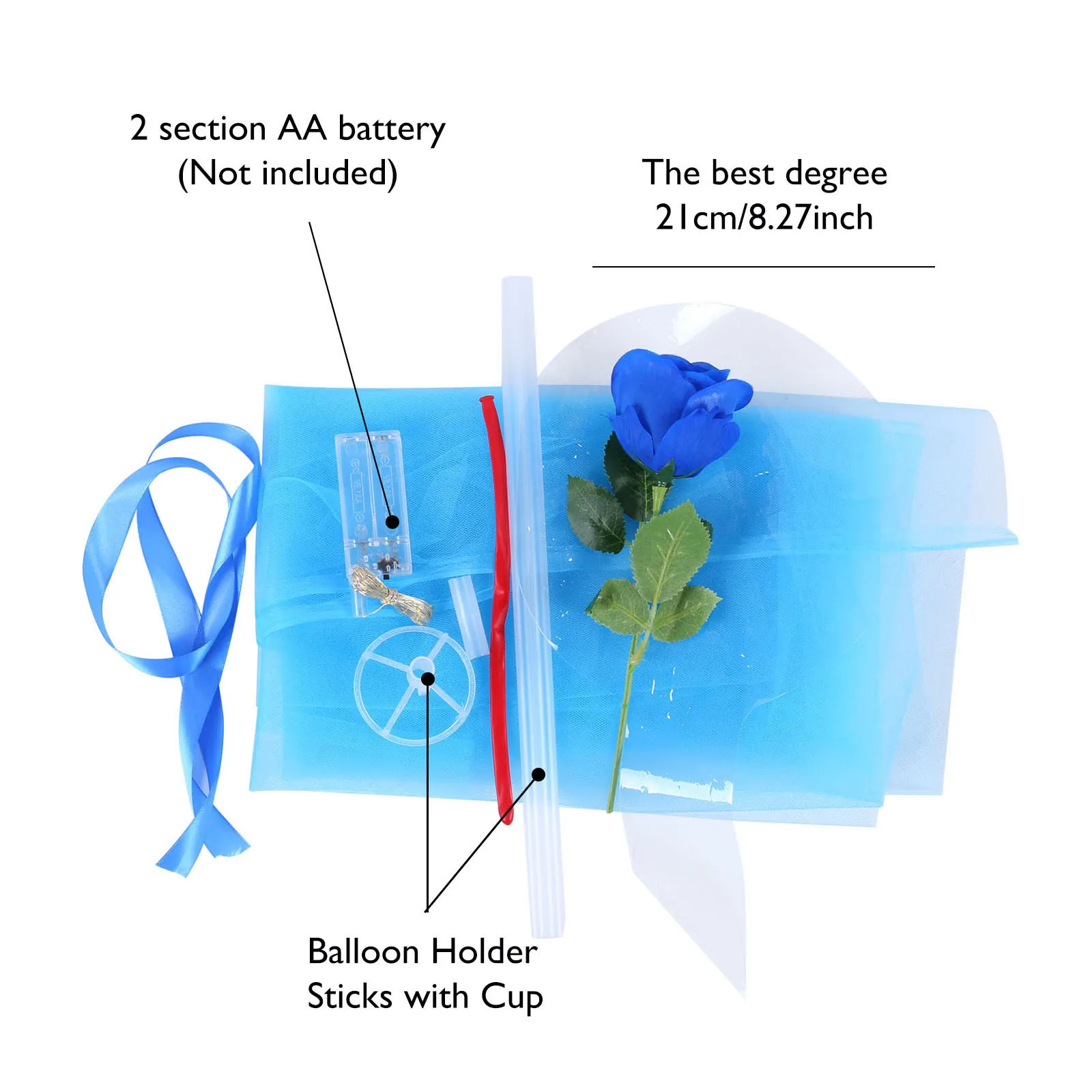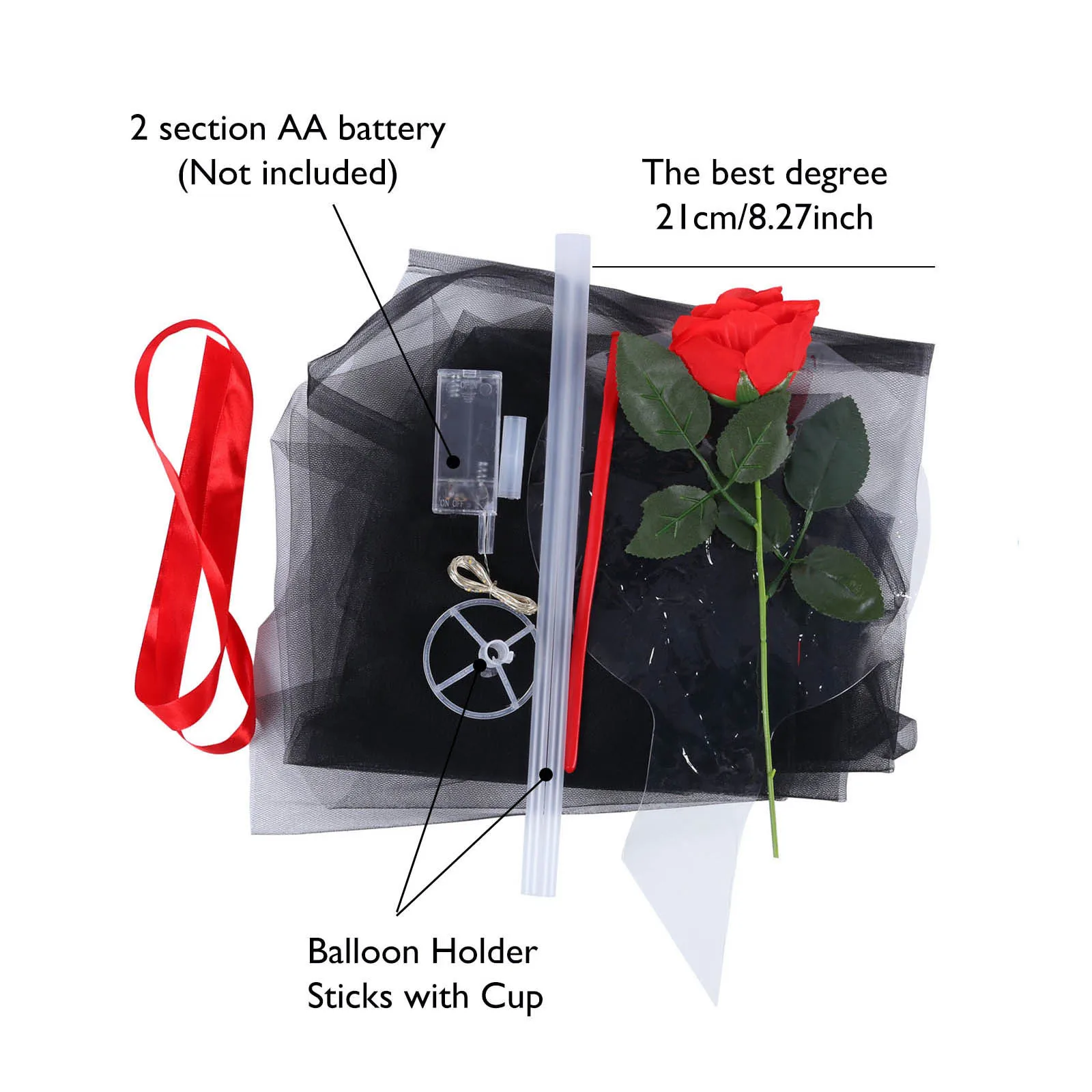 Посылка включает: 1 Роза ручной работы 1 комплект x специальный шар 1 х подходящая лента 1x70 см Специальный буксировочный баллон 1 x феи 1 комплект x 3 метра Теплый цветной светильник 1 x насосы