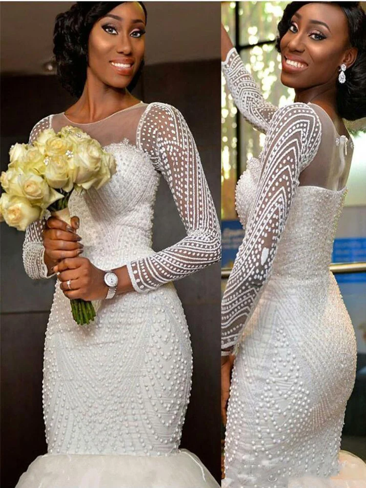 Потрясающие Свадебные платья с длинным рукавом и юбкой-годе 2017, платья из тюля с бисером, свадебные платья на молнии со шлейфом