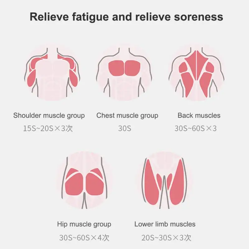 -Облегчение скованности и болезненности: массажер используется для снятия мышечной скованности и болезненности, улучшения кровообращения и лимфатического кровообращения, ускорения восстановления после упражнений и спортивных травм, улучшает общее состояние мягких тканей организма и предотвращает воспаления, вызванные адгезией между фасцией и мышцами.