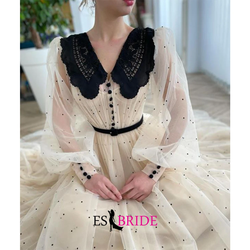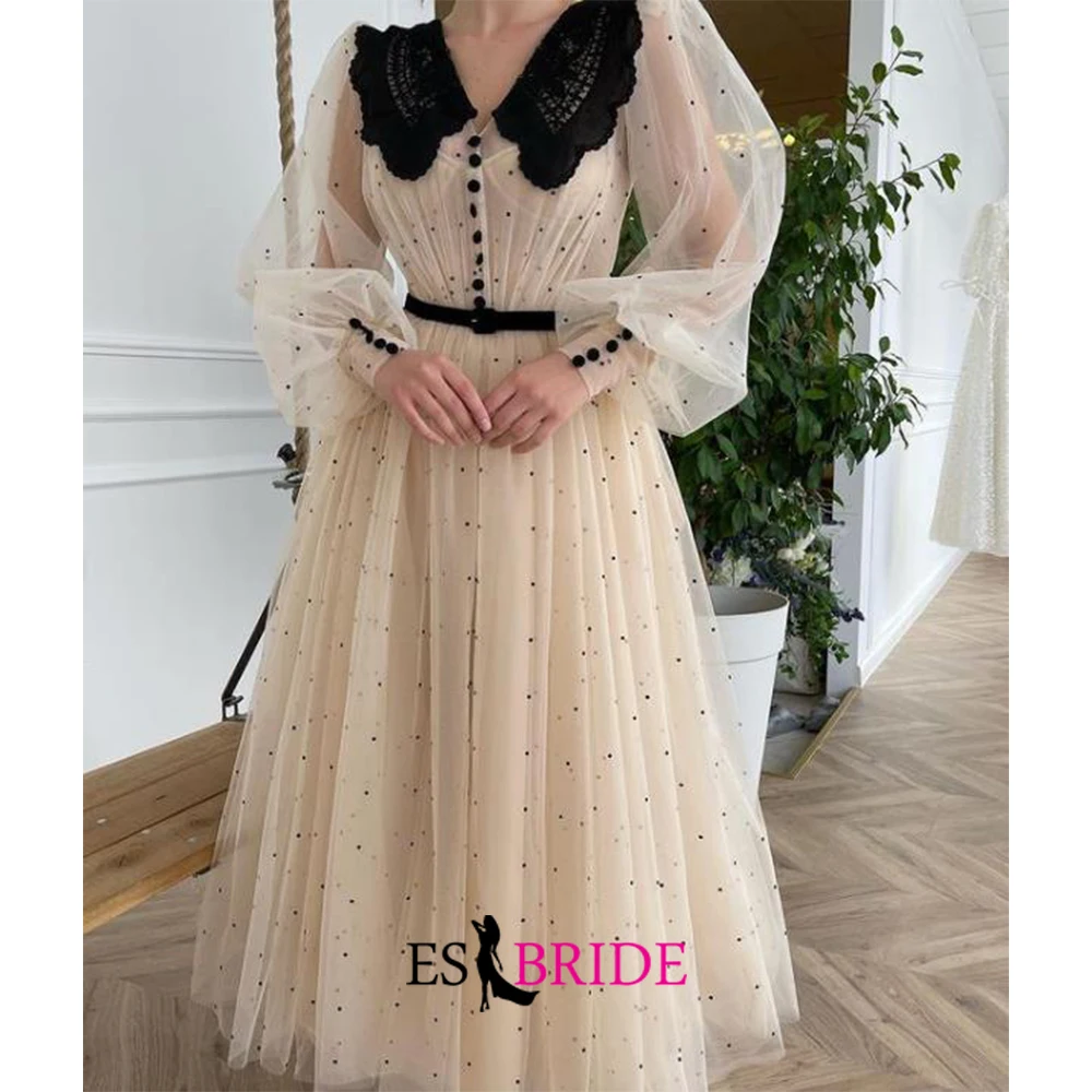 Элегантное платье в горошек бежевый фатиновые платья для выпускного вечера с длинными пышными рукавами черный лацканов Шея кнопки 2021 трапециевидной формы Чай Длина платье для выпускного вечера