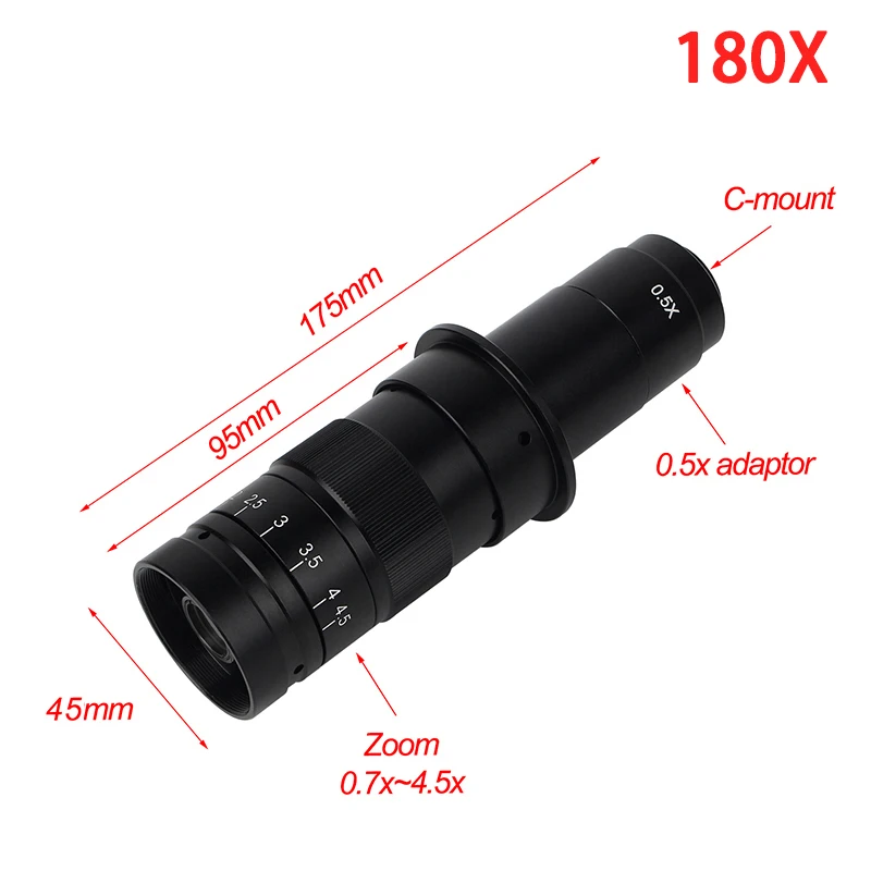Особенности Высокое качество, высокое разрешение, для использования требуется камера микроскопа c-mount. Адаптер с-образным креплением 0,5x Соотношение масштабирования: 6,5: 1 Рабочее расстояние: 50 ~ 155 мм Объектив с креплением Zoom C Увеличение: 8X ~ 180X Размер: 175 мм * 50 мм Вес: 0,57 кг Пожалуйста, не прикасайтесь к объективу руками, это приведет к царапинам линз. Если вам нужно справиться с этим, пожалуйста, протрите его профессиональной тканью для камеры.