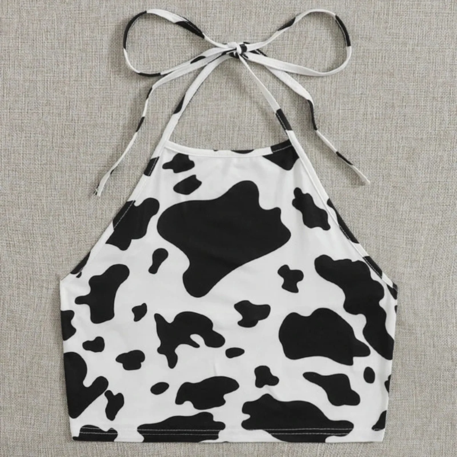Укороченный Женский Топ с V-образным вырезом, пикантный корсет с лямкой на шее, с открытой спиной, модный бандажный укороченный Топ с коровьим принтом, блузка, Топ
