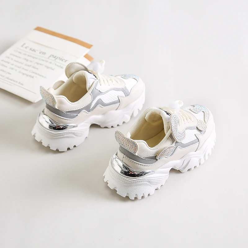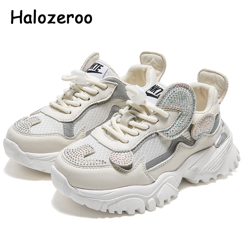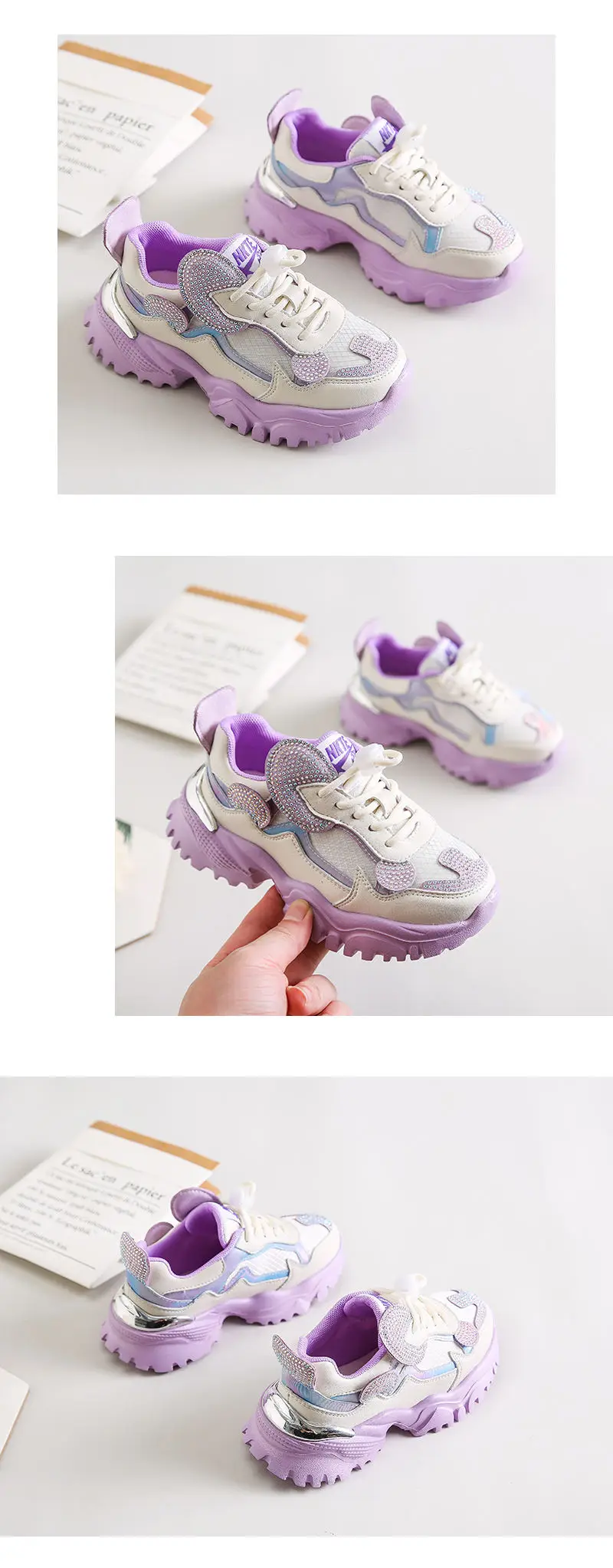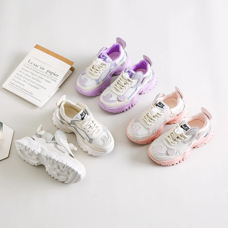 2021 Весенняя Спортивная одежда для детей, спортивная одежда для маленьких мальчиков; Брендовая обувь; Детские белые кроссовки в повседневном стиле для девочек Стразы массивные кроссовки