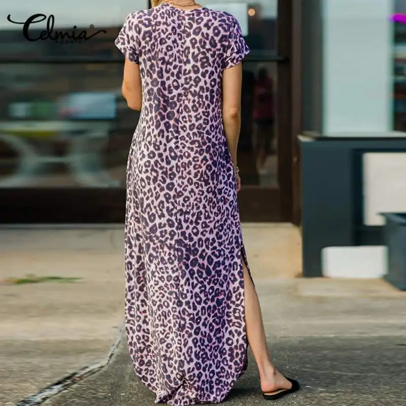 Женское летнее платье-макси Celmia с коротким рукавом и V-образным вырезом, сексуальный сарафан с леопардовым принтом, модные пляжные платья с разрезом и подолом, 2021