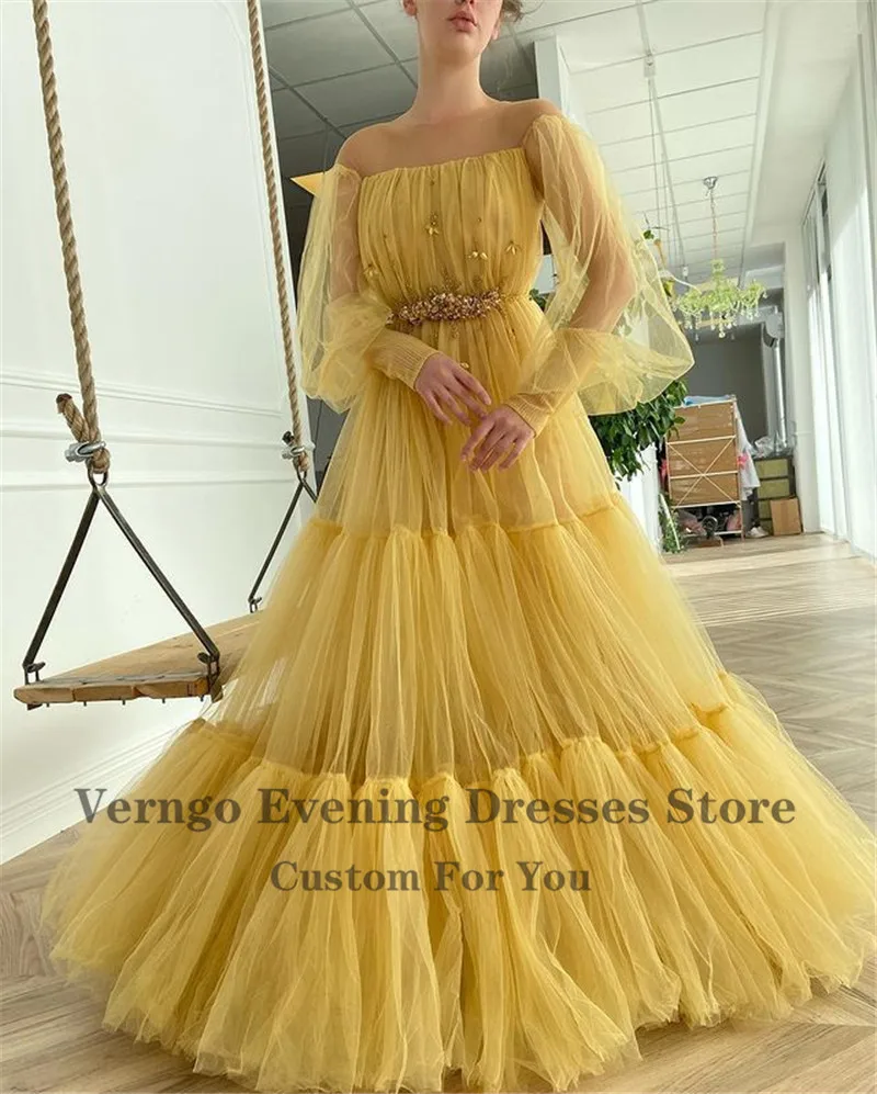 Verngo 2021 новейшие ретро желтые тюлевые платья для выпускного вечера с пышными длинными рукавами с О-образным вырезом Кристальный пояс до пола Вечерние платья под заказ