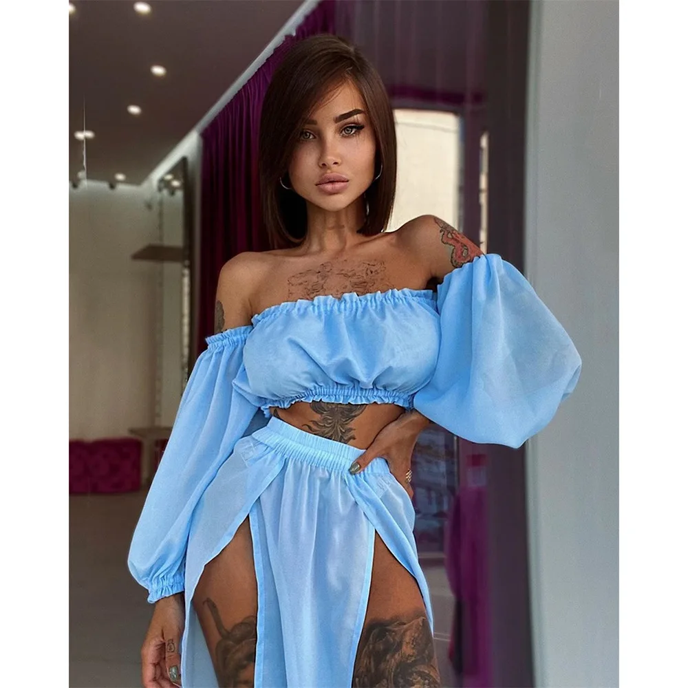 Женский комплект из двух предметов, топ с открытыми плечами, длинным рукавом и прикрытая юбка, для путешествий, пляжа, отпуска