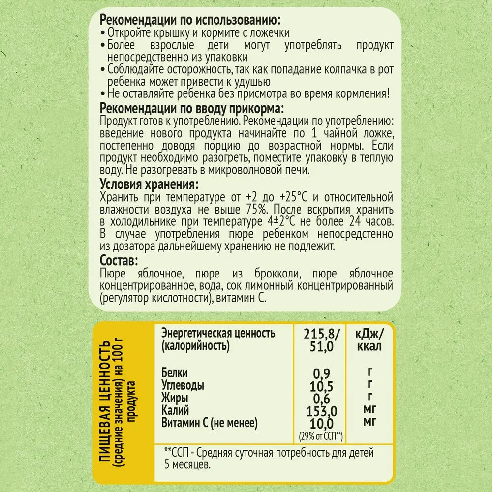 Пришло очень быстро в почтомат! Ребёнок брокколи просто не сильно любит, а этот ест (хотя по мне так как будто без яблока )