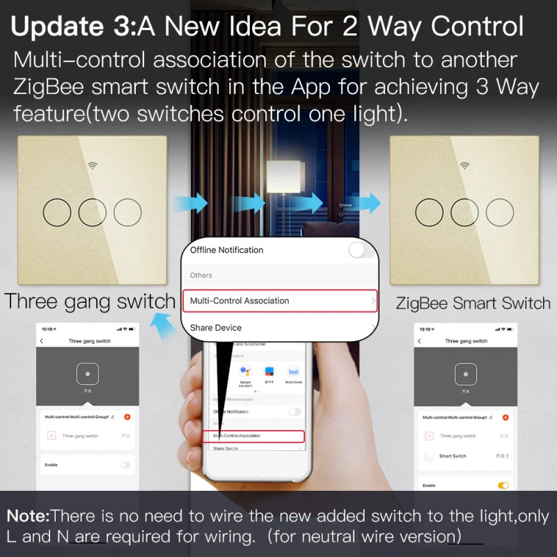 Мульти-контроль связи переключателя на другой смарт-коммутатор ZigBee в приложении для достижения 3 функции (два переключателя управляют один светильник).