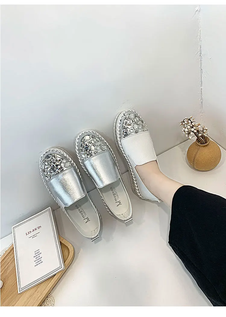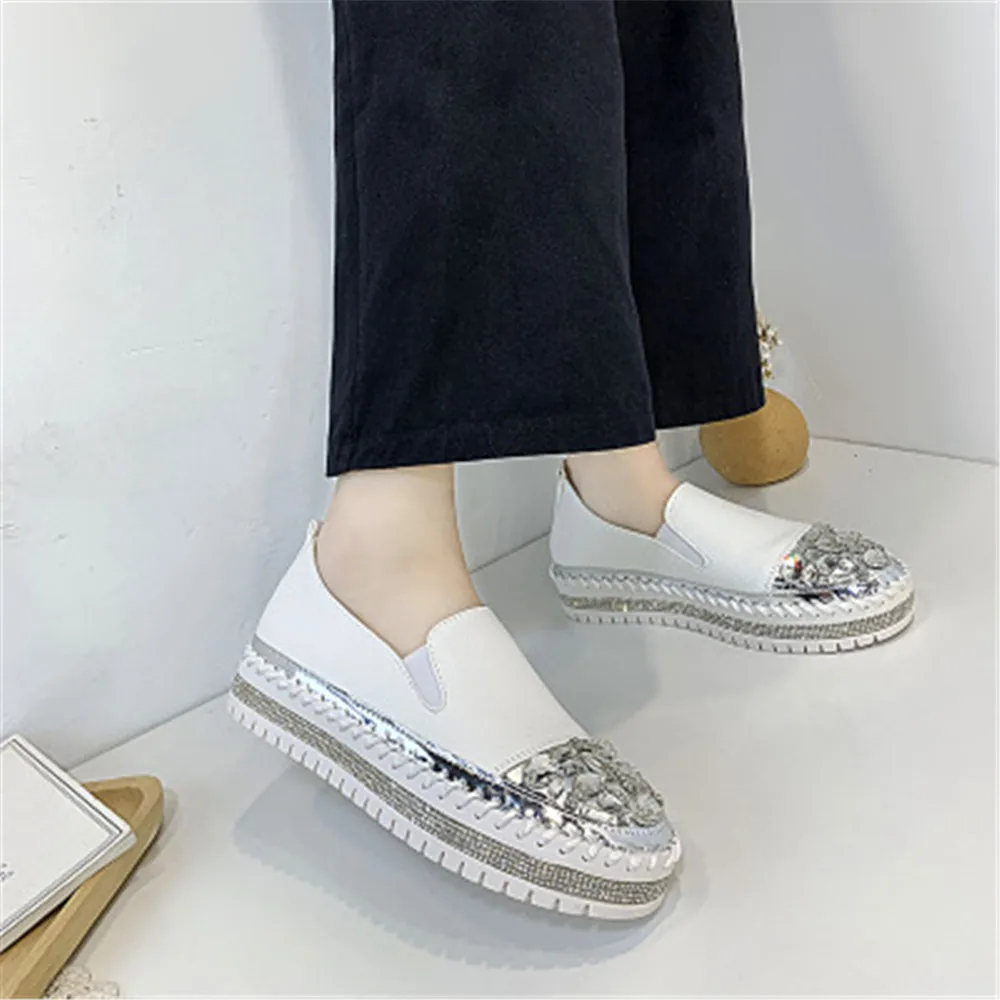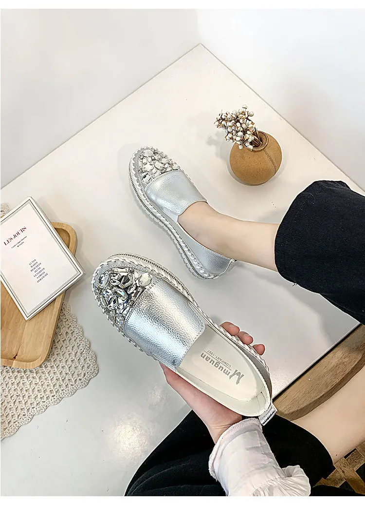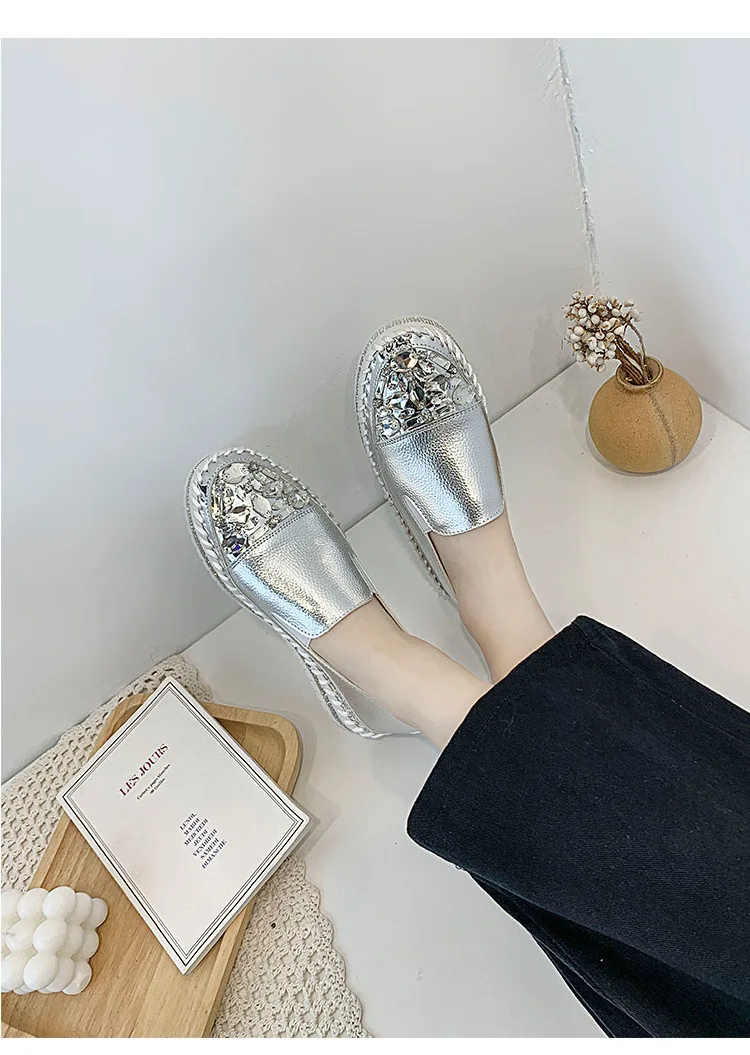 Туфли женские кожаные на плоской подошве, блестящие лоферы, круглый носок, кристаллы, повседневная обувь для пар, Размеры 35-43