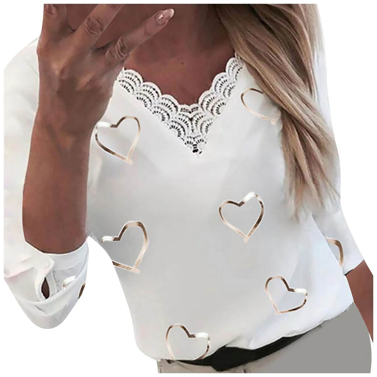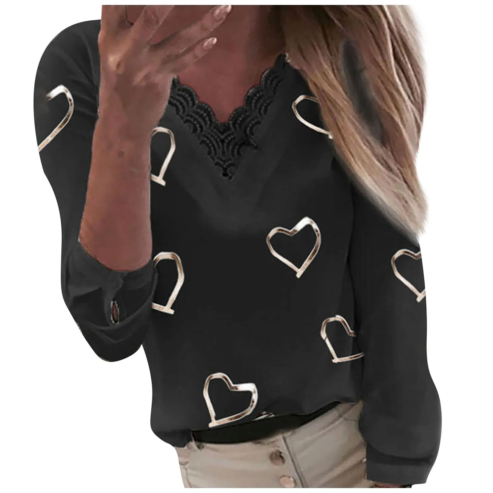 Осеннее кружевное платье Элегантный Блузки для женщин принт в виде сердечек, с декольте, с кружевами, в стиле пэчворк с длинными рукавами Футболка Блуза Топ больших размеров женская одежда @ 40