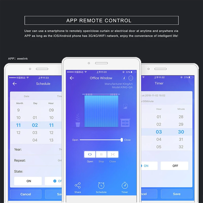 Пользователь может использовать смартфон для удаленного открытия/закрытия занавески или электрической двери в любое время и в любом месте через приложение, если телефон iOS / Android имеет сеть 3G / 4G/Wi-Fi, наслаждайтесь удобством интеллектуальной жизни! Применение: TUYA Smart.