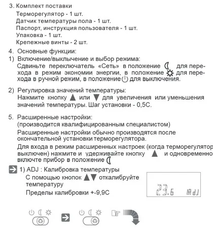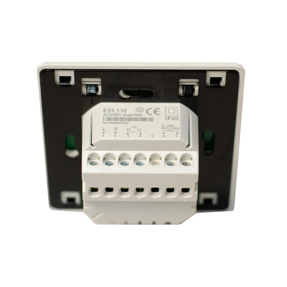 У терморегулятора E 31.116 есть возможность работать как в автоматическом, так и в ручном режиме. Устройство позволяет настроить два режима работы: «эконом» и «комфорт». В процессе экономичной работы средняя температура помещений будет 15 градусов, что минимизирует расход электроэнергии. Комфортный режим позволяет устанавливать любую температуру, которая необходима.