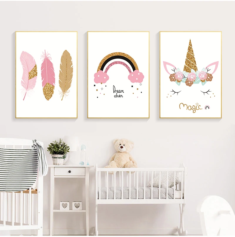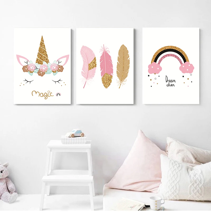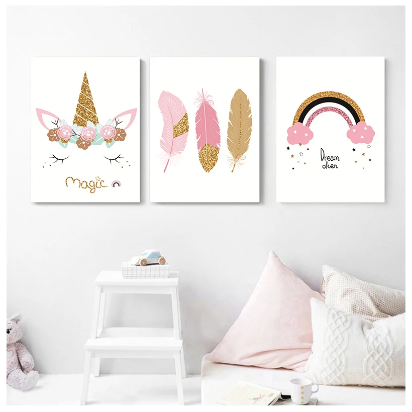 Картина на холсте с изображением розового единорога, волшебный постер мечты радуги, для детской комнаты, для девочек, милые декоративные картины для стен