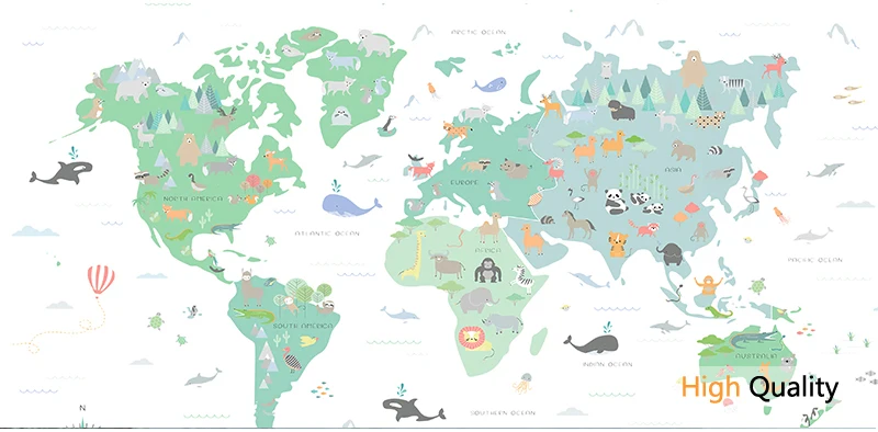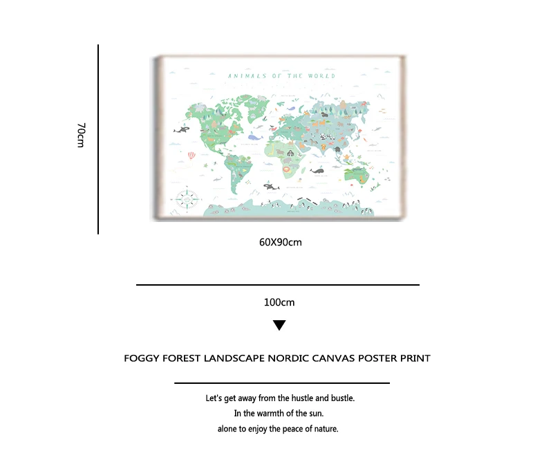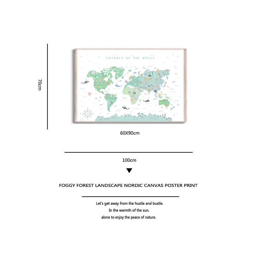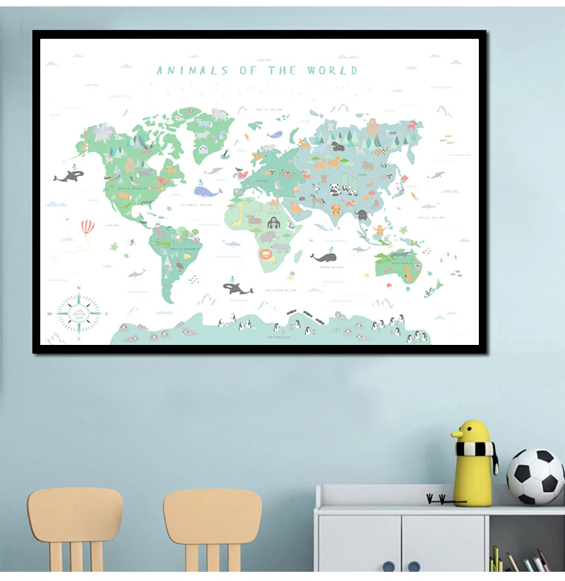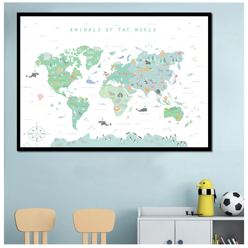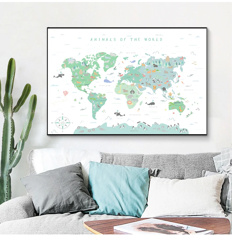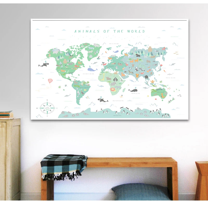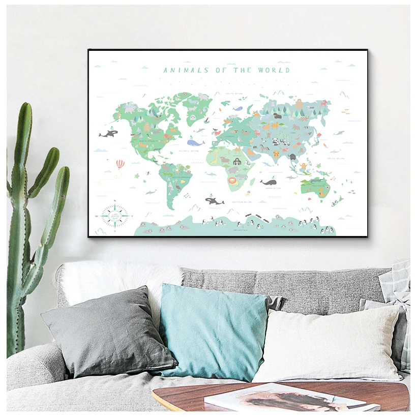 Животные иллюстрация карта мира настенные картины принт для детской картина учебный плакат с рисунками зверей из мультфильмов, для детской комнаты, Декор