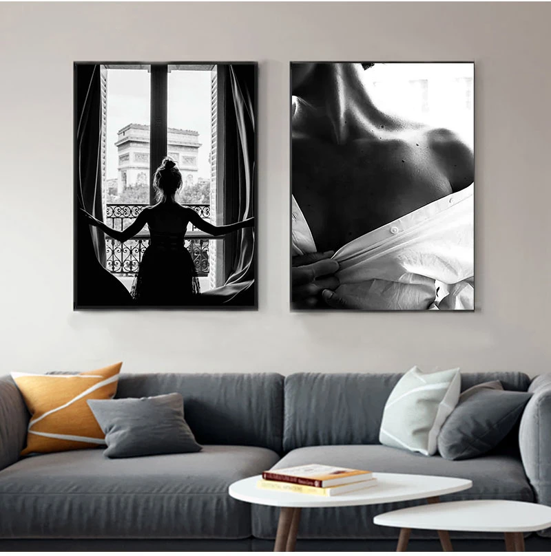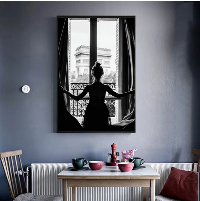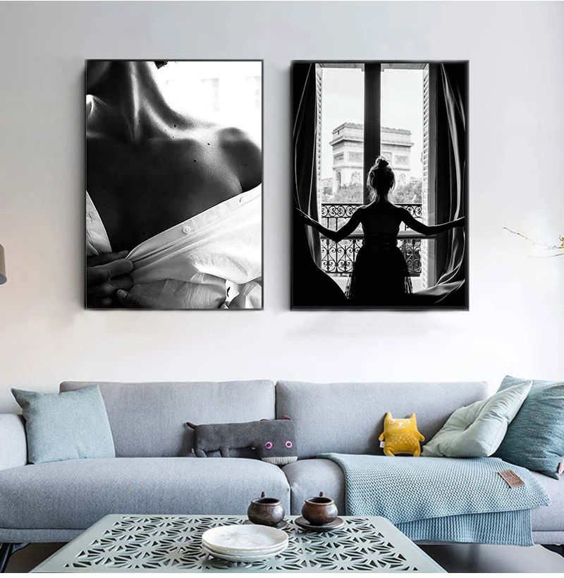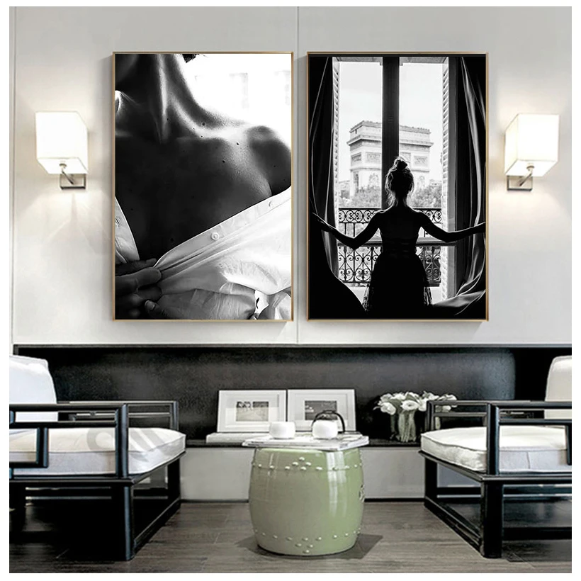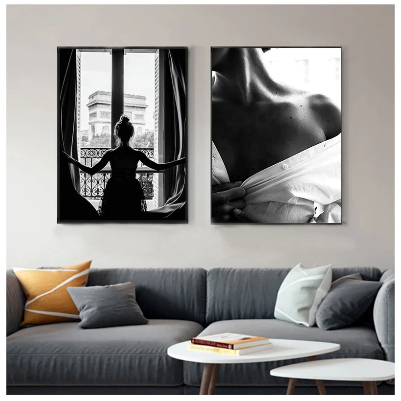 Черно-белые сексуальные Скандинавская Картина на холсте с окном для девушек, модные красивые плакаты для женщин, настенные художественные картины, декор для гостиной и дома