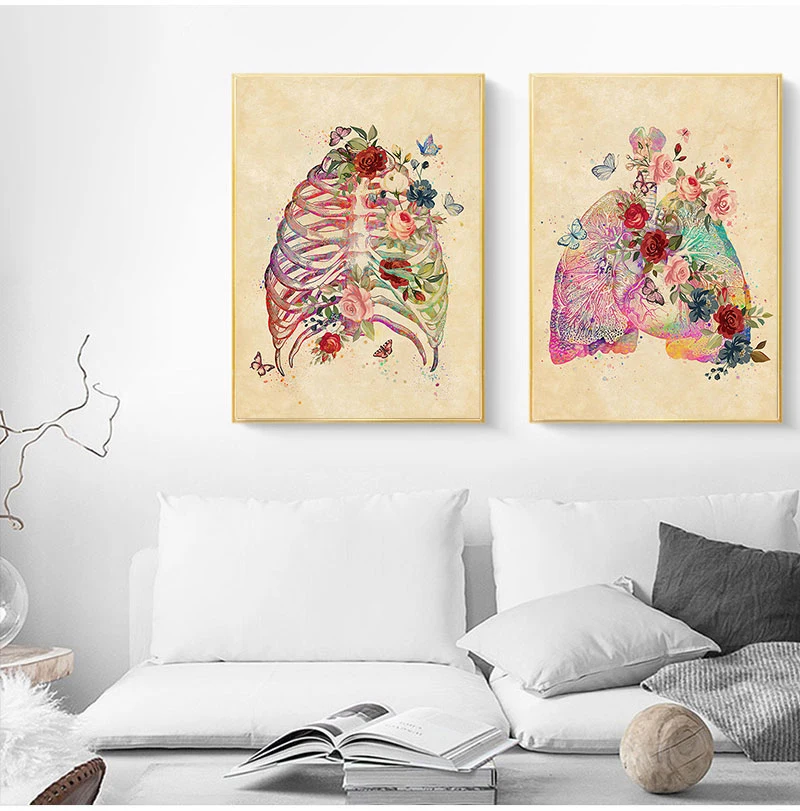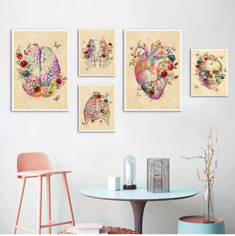 Настенная картина с изображением мозга, сердца, черепа, цветов, анатомии, винтажная Картина на холсте, скандинавские плакаты и принты, настенные картины для декора гостиной
