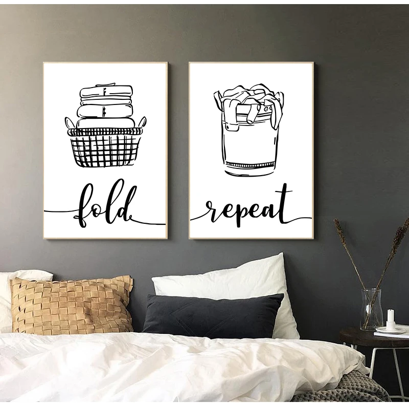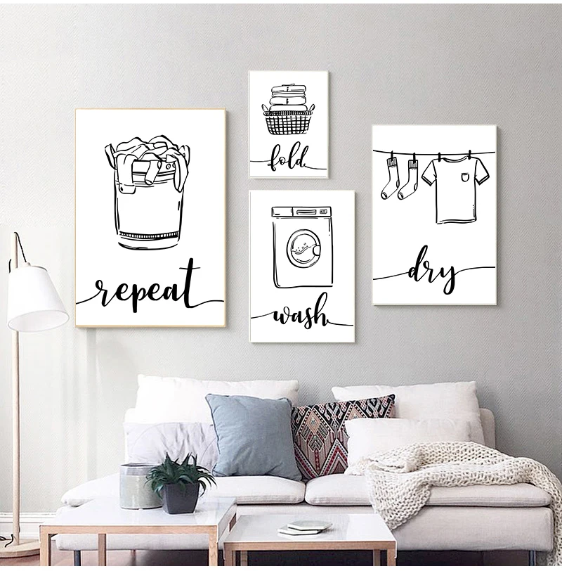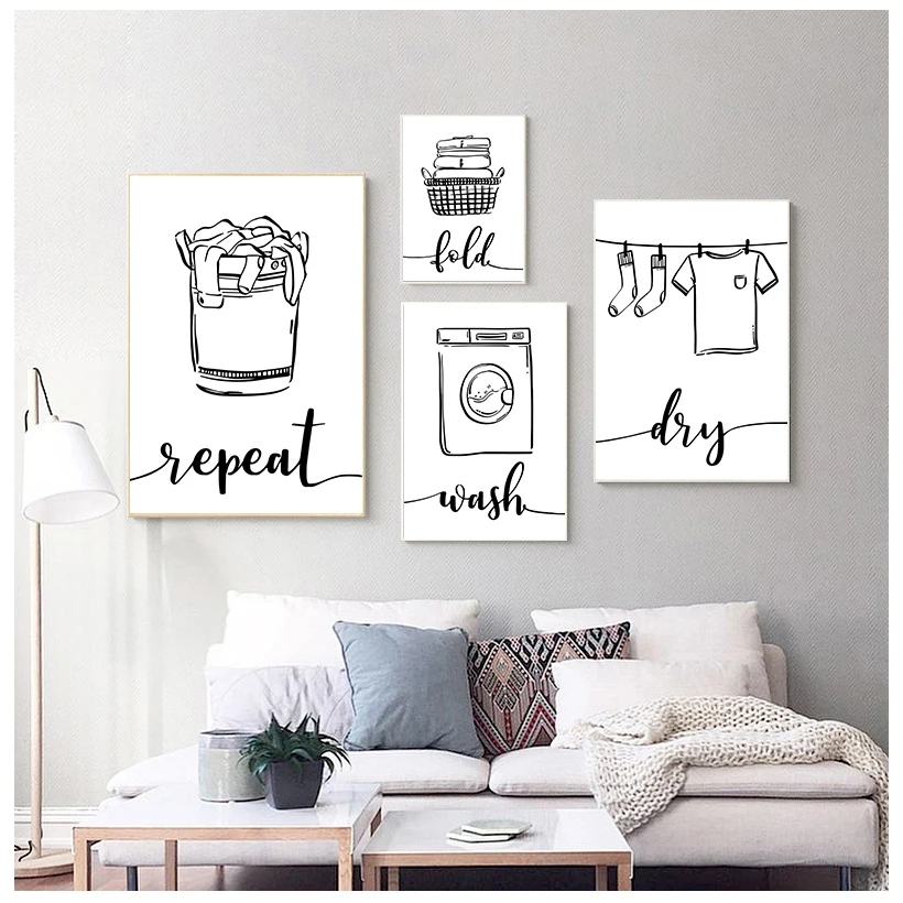 Настенная живопись, печатная картина, скандинавский постер, стирать, сушить, повторить, табличка с надписью прачечной черно-белые картины, декор для ванной, дома, модульный